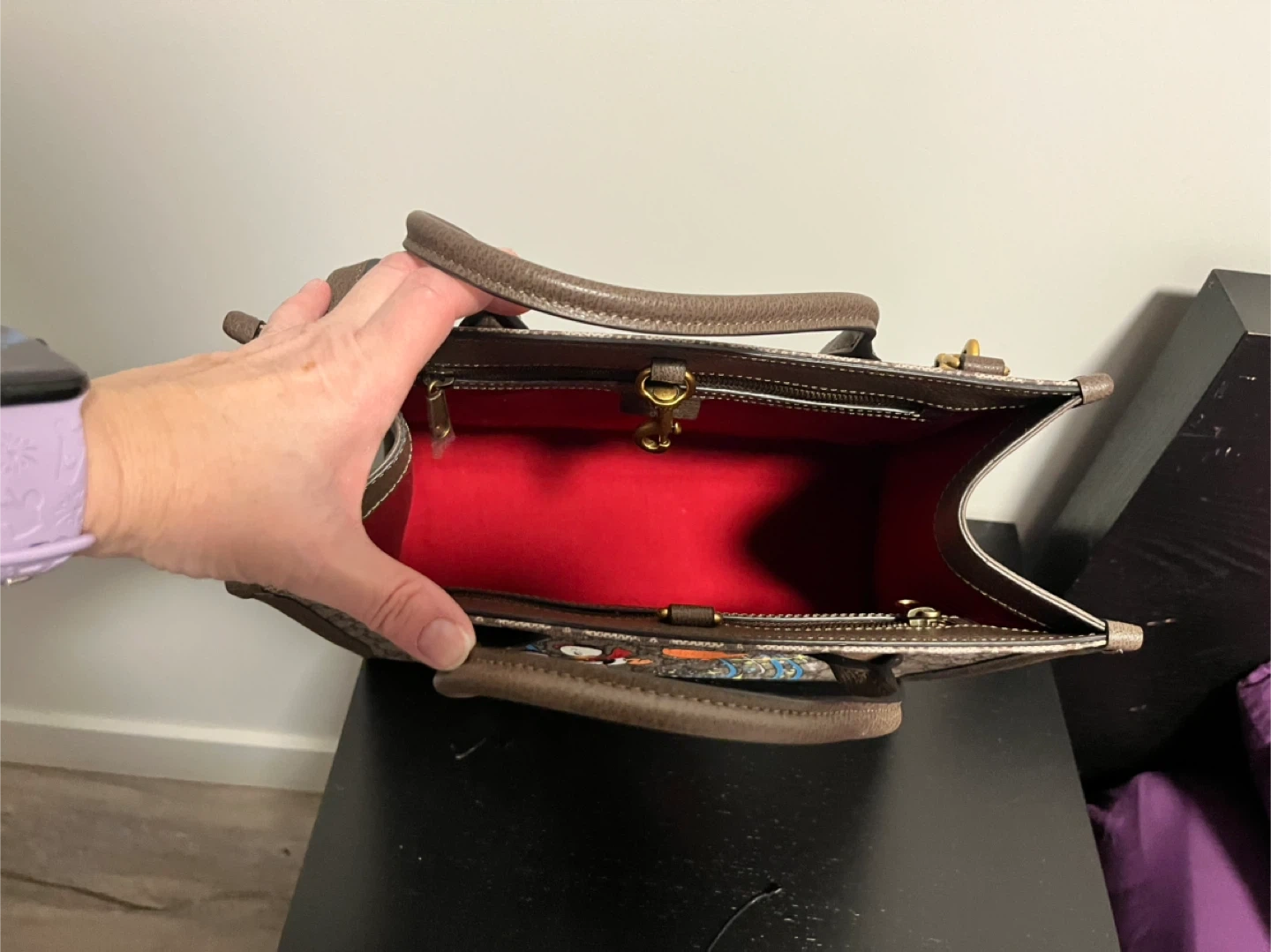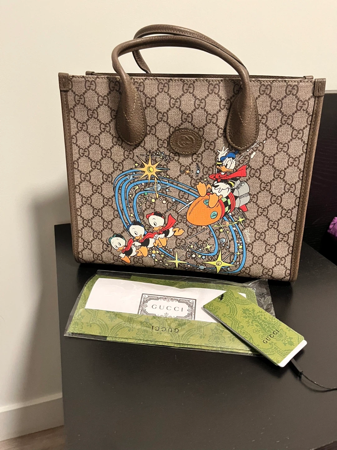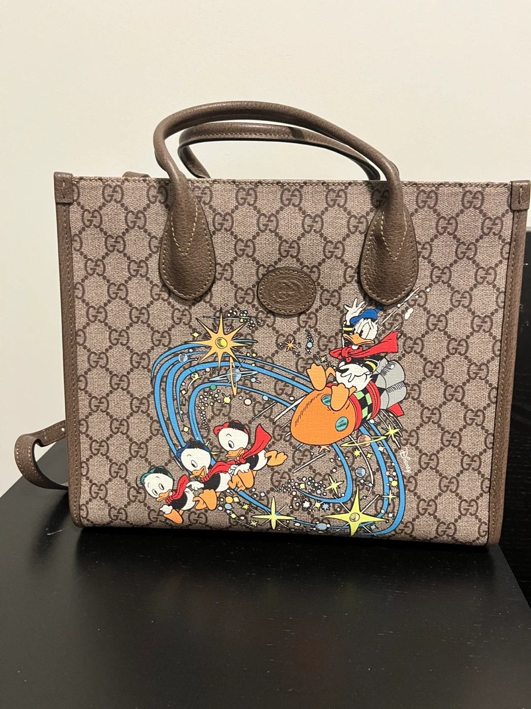 Gucci bag featuring Donald Duck and his nephews. Brand new, only taken out to photograph. Comes with dust cover.
