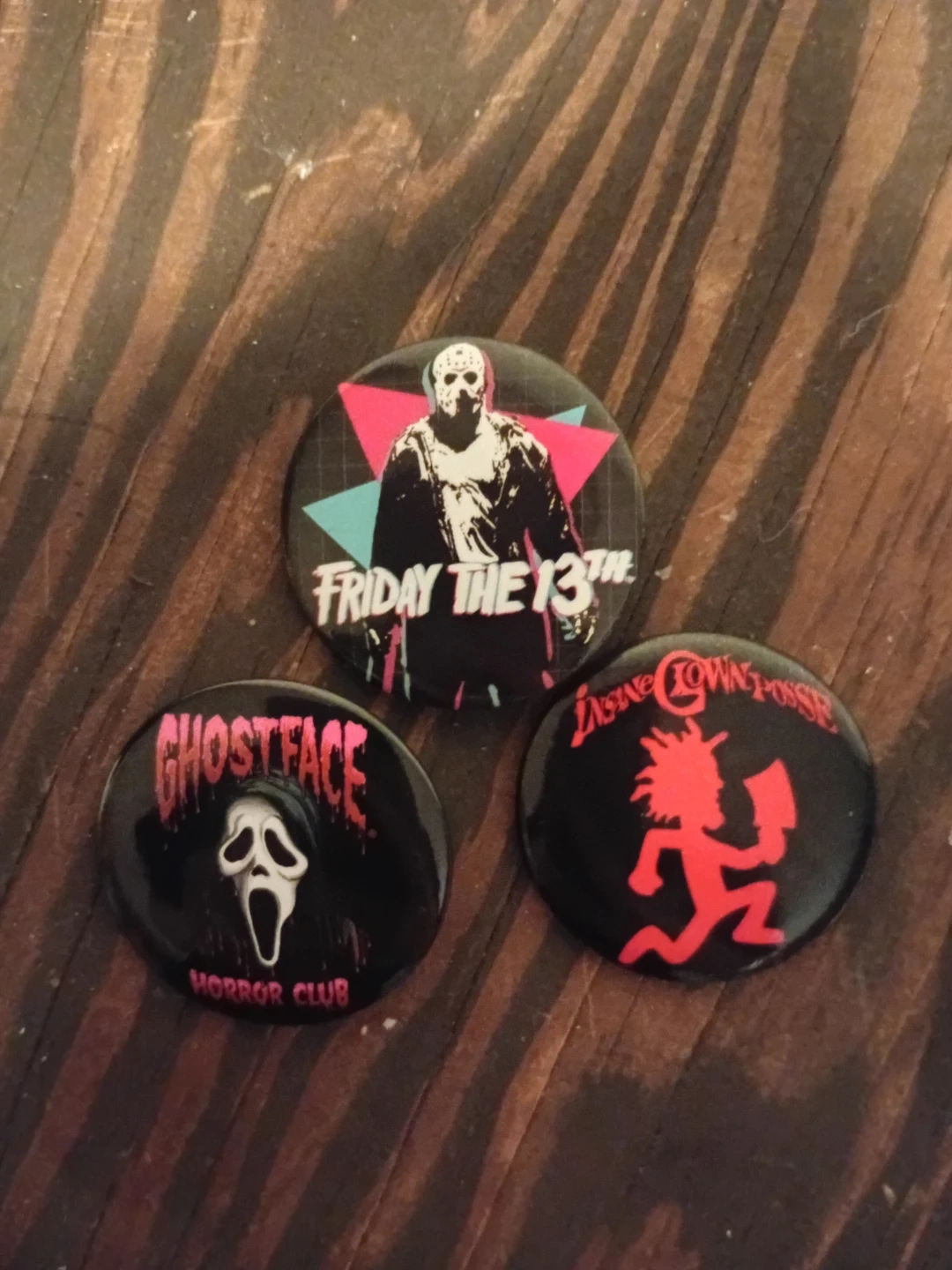 Three button pins featuring Ghostface from Scream, Friday the 13th, and Insane Clown Posse. These are great for personalizing jackets or bags. Perfect for horror movie fans!