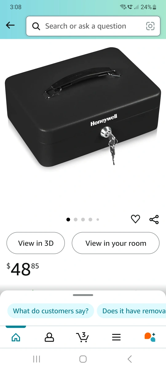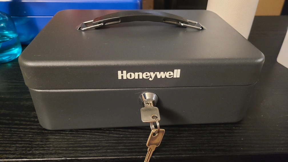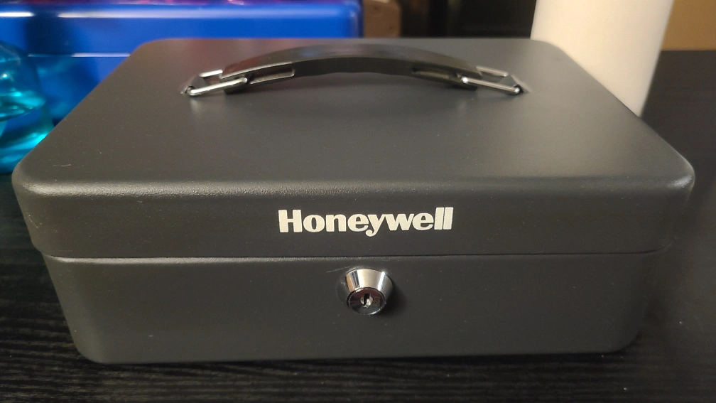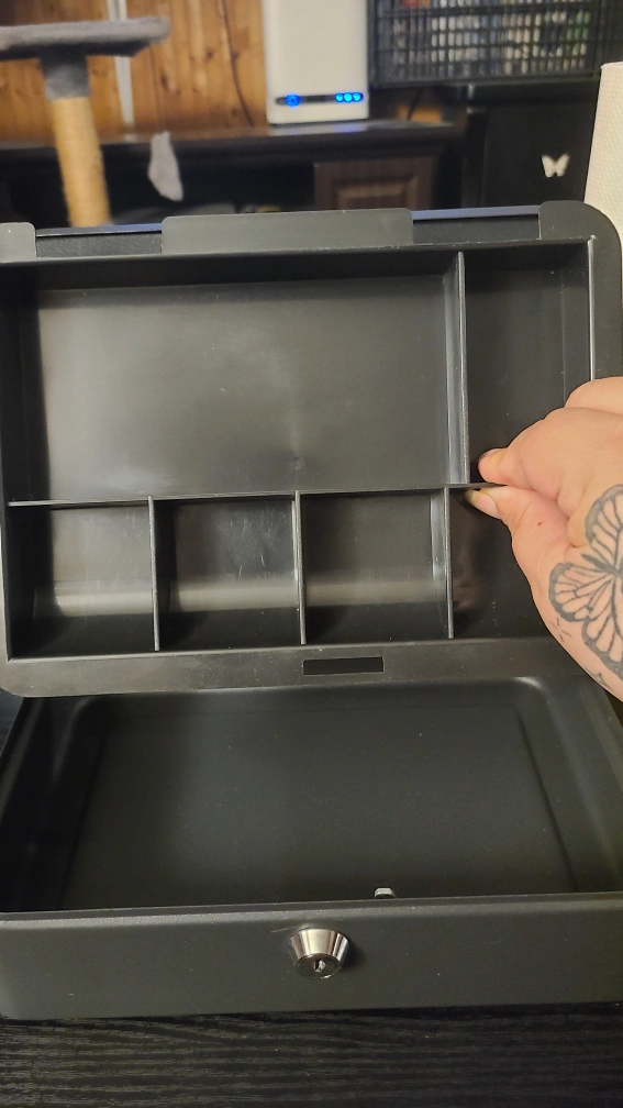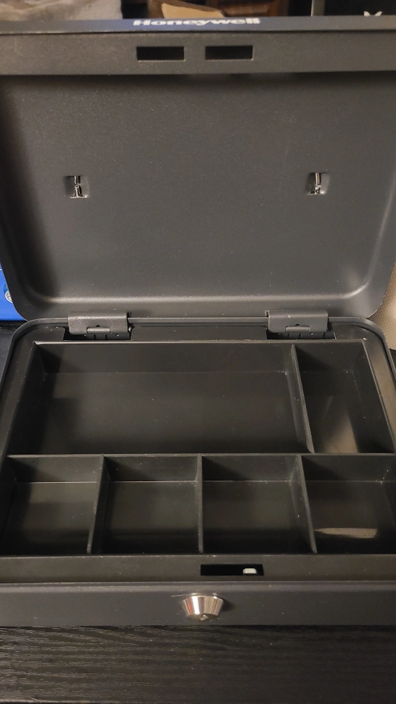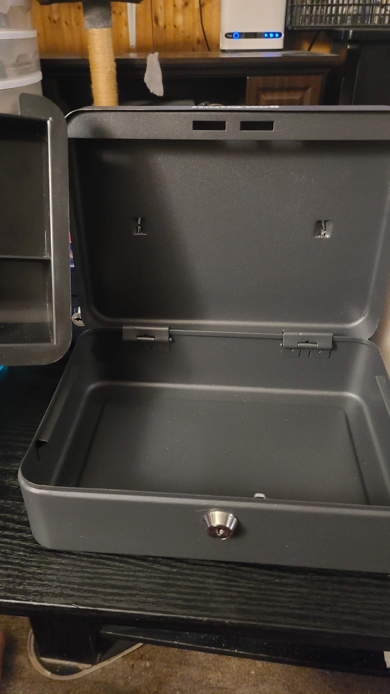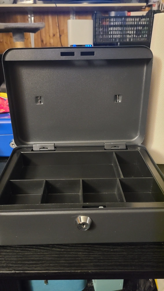 Grey metal cash box. Features a removable tray with compartments. Includes a key lock and carrying handle. Great for storing money.