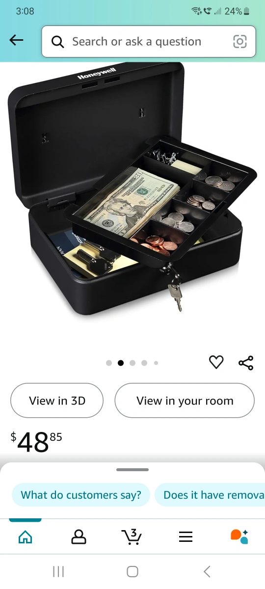 Grey metal cash box. Features a removable tray with compartments. Includes a key lock and carrying handle. Great for storing money.