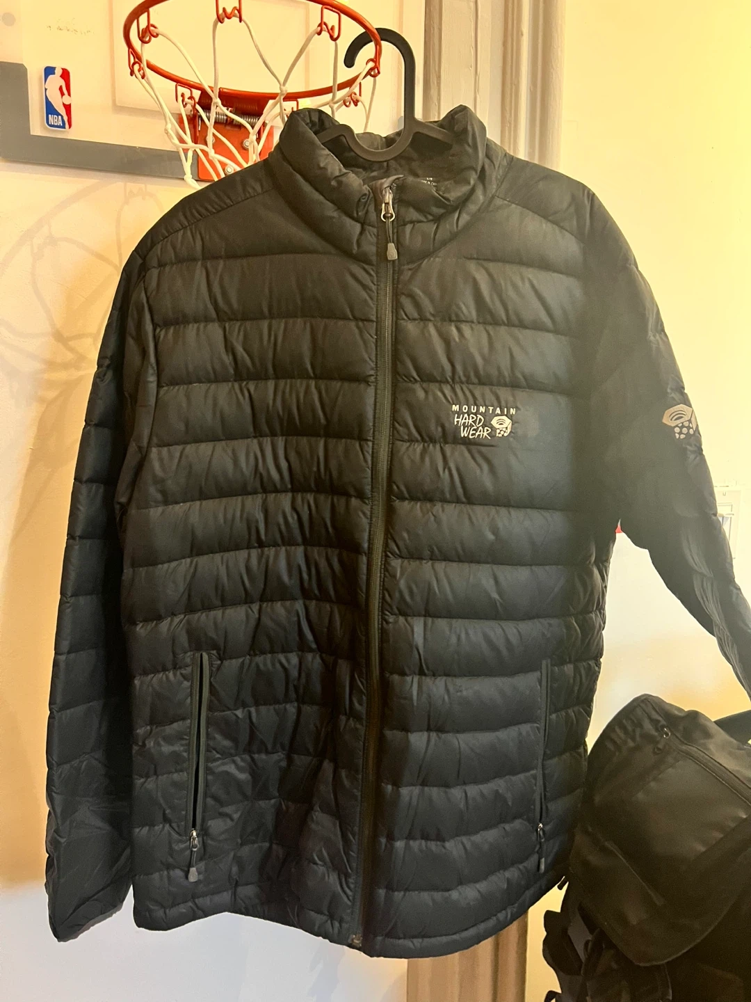 This is a black Mountain Hardwear puffer jacket. It's a size large and made in China. It's lightweight and perfect for layering on colder days.