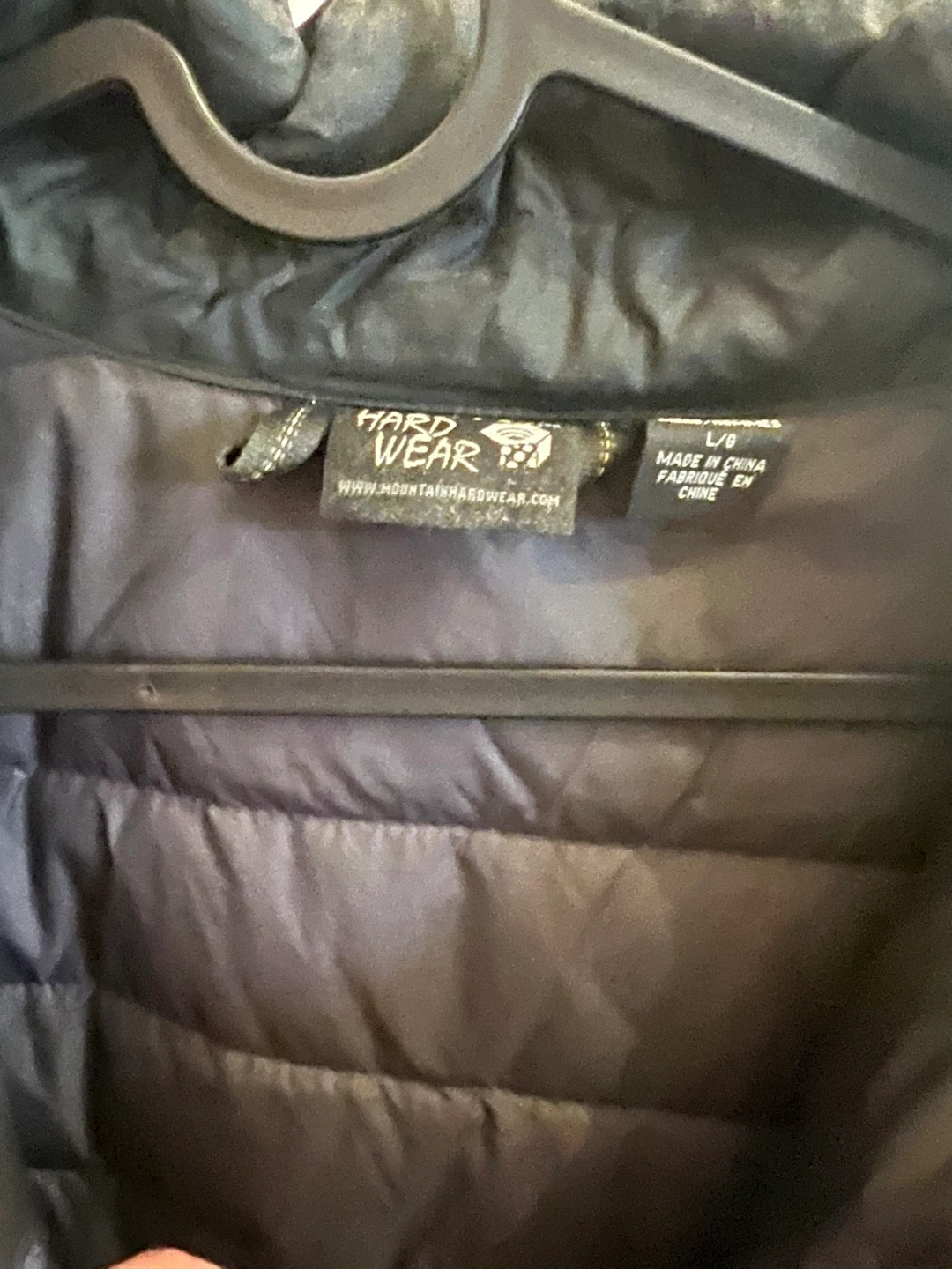 This is a black Mountain Hardwear puffer jacket. It's a size large and made in China. It's lightweight and perfect for layering on colder days.
