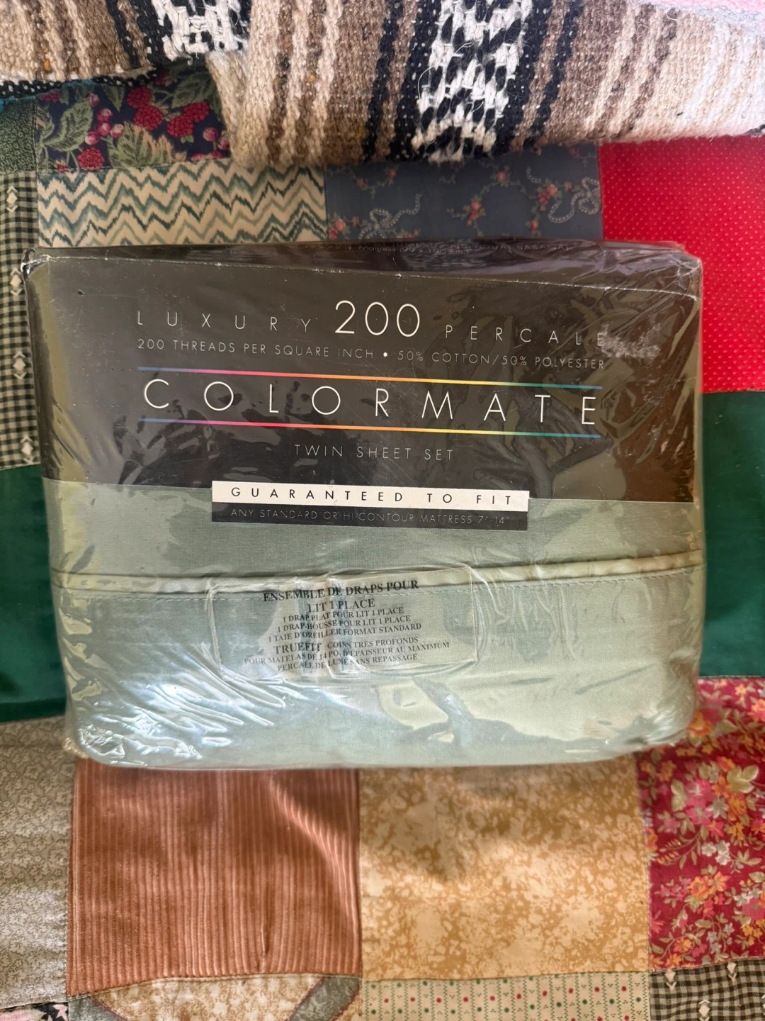 This is a ColorMATE luxury twin sheet set. It's made with a 200 thread count percale blend of 50% cotton and 50% polyester. Guaranteed to fit standard or hi-contour mattresses 7-14 inches deep.