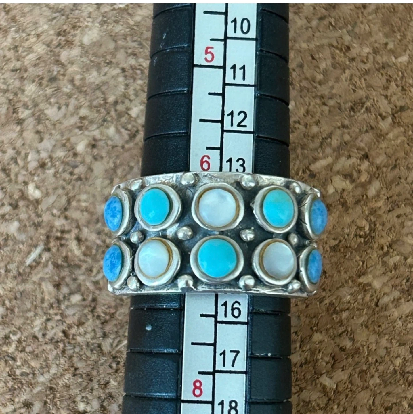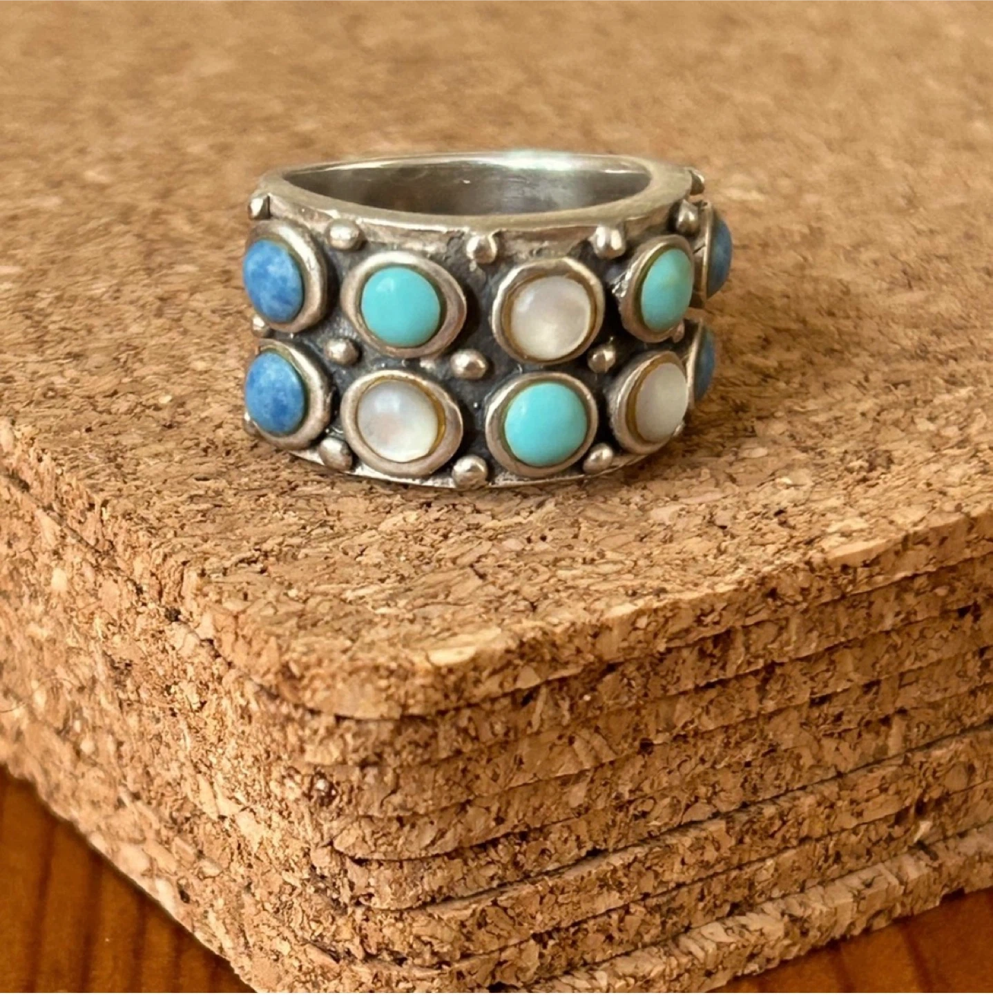 Preloved, solid sterling silver with coloured gemstones, with very nice weight to it, a very solid ring! Measures between size 6-6.5 on mandrel.
