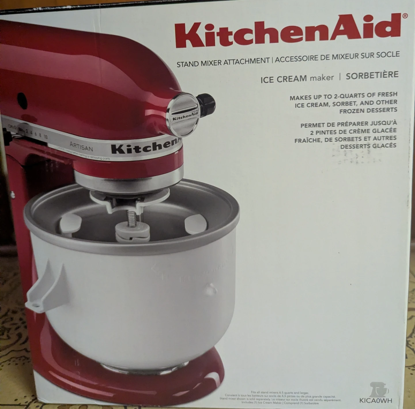 This KitchenAid attachment makes up to 2 quarts of fresh ice cream, sorbet, and other frozen desserts. It fits all KitchenAid stand mixers 4.5 quarts and larger. Make delicious frozen treats at home! Includes original manual.