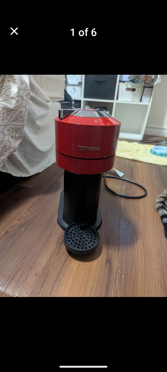Selling a Nespresso coffee machine in red and black. It's in great condition and ready to make some delicious coffee! Perfect for those who love a quick and easy caffeine fix