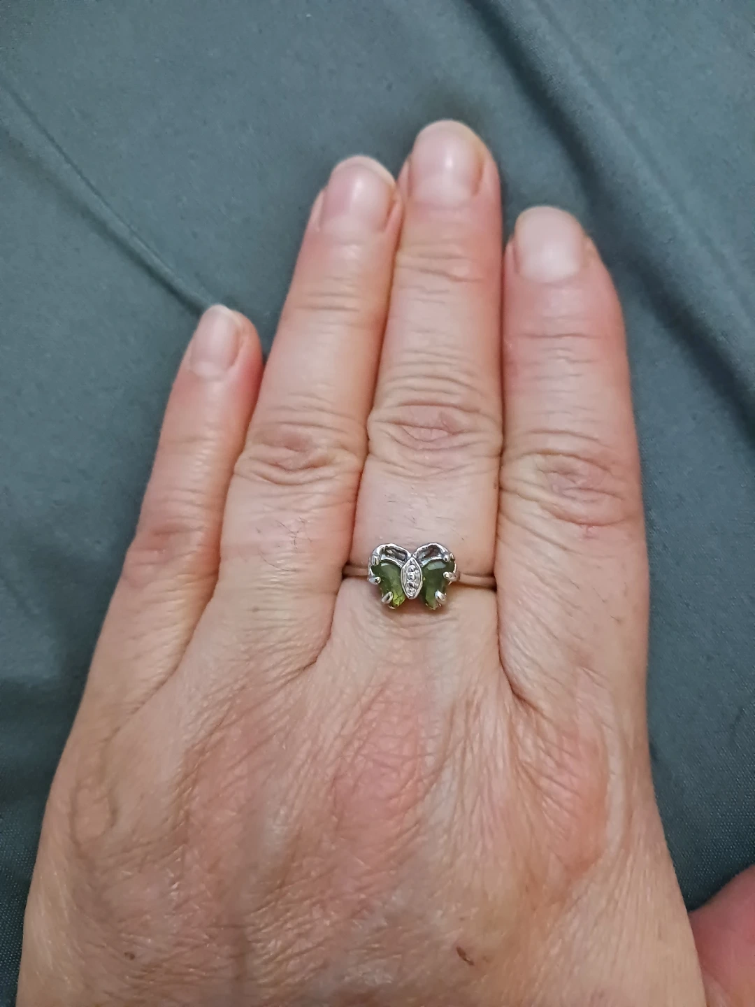 A cute butterfly ring! It features green stones and a small diamond accent. Perfect for adding a touch of whimsy to any outfit. Not real