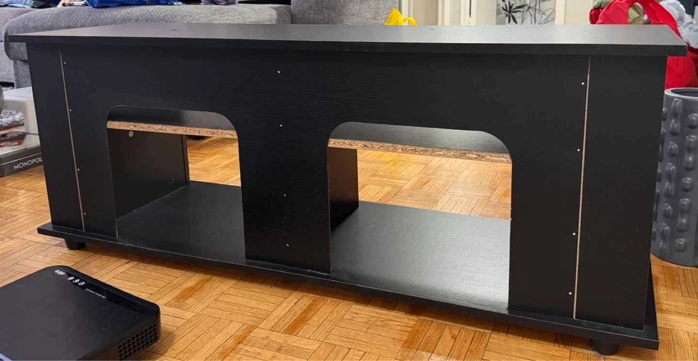 Black media console with two shelves. 1.21M length, 47CM height, and 37.5CM depth. Supports your television and media devices.