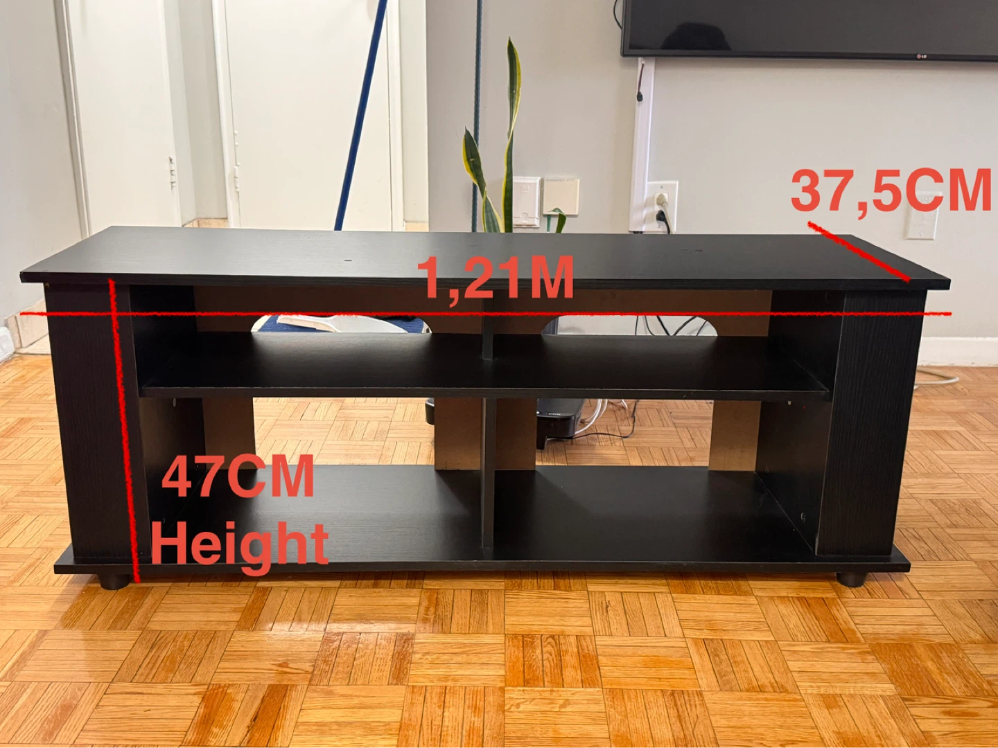 Black media console with two shelves. 1.21M length, 47CM height, and 37.5CM depth. Supports your television and media devices.