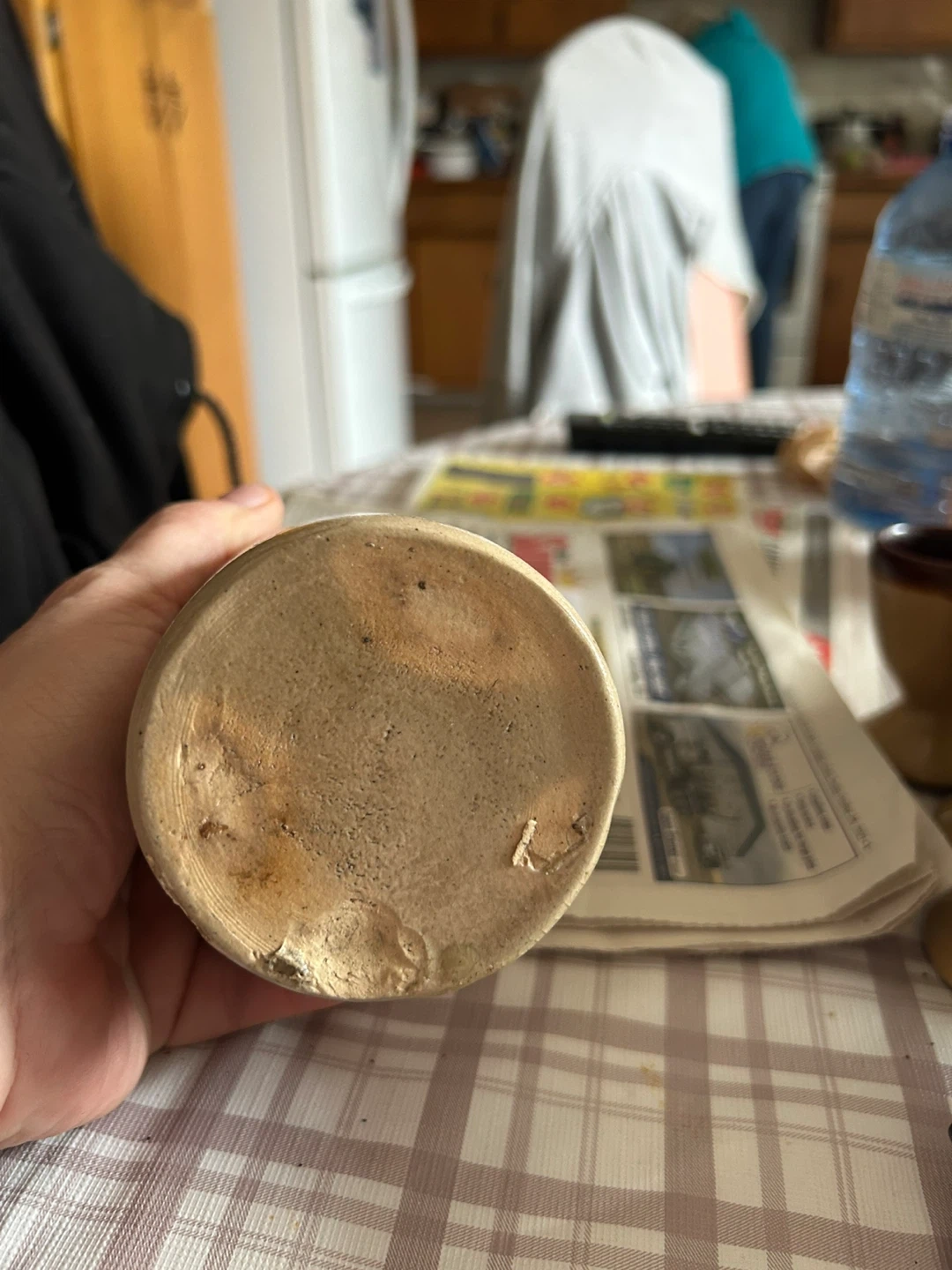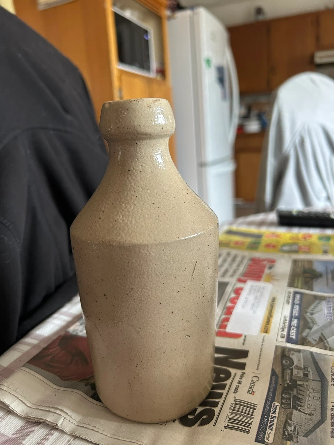 Here's a vintage stoneware bottle! It has a lovely, rustic look and would be a great addition to any collection or as a decorative piece around the house. It shows some signs of wear, which adds to its vintage charm