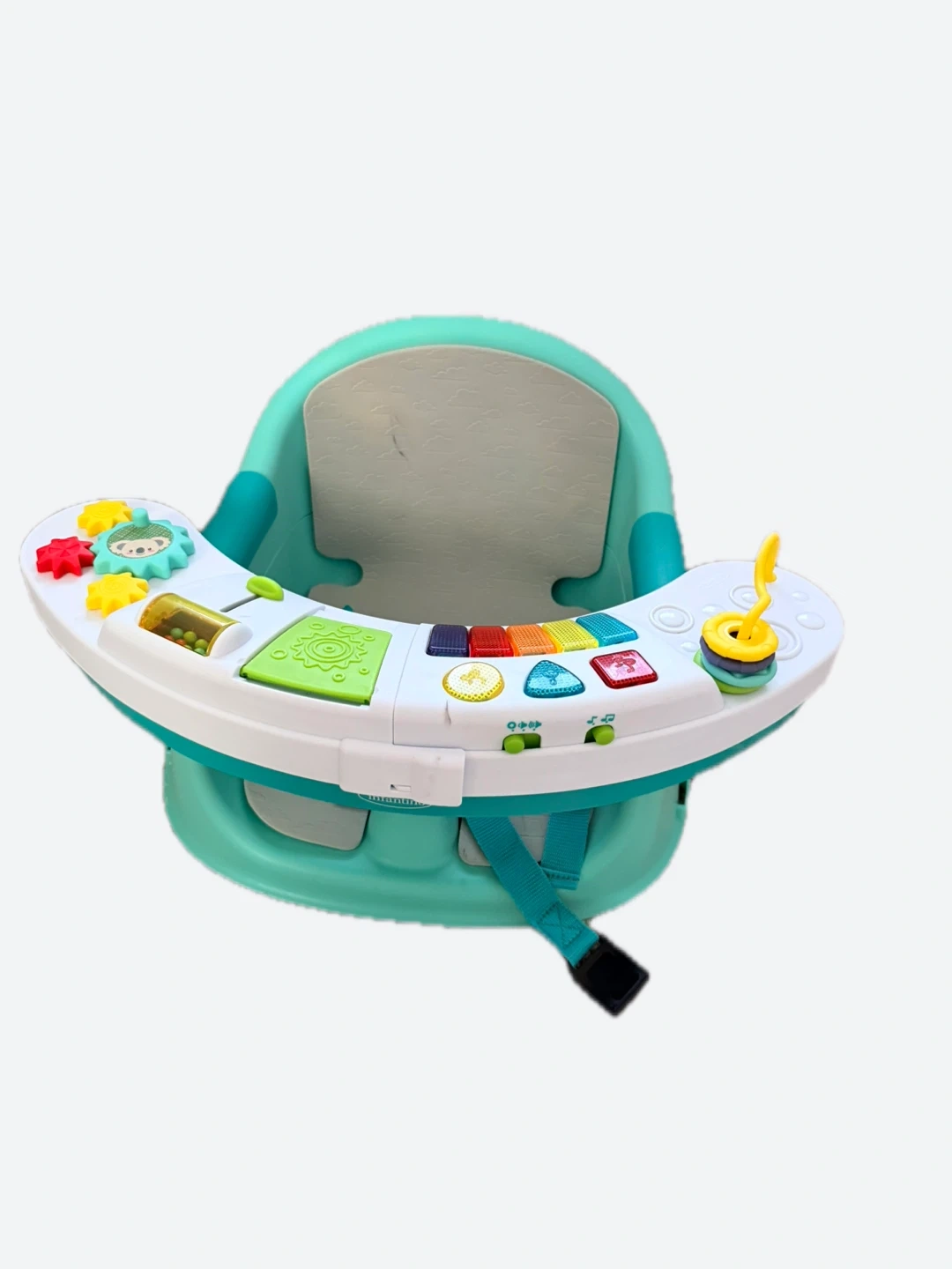 This is a turquoise and white baby activity seat. It features a musical toy tray with colorful buttons and interactive elements. Includes safety straps for secure attachment.