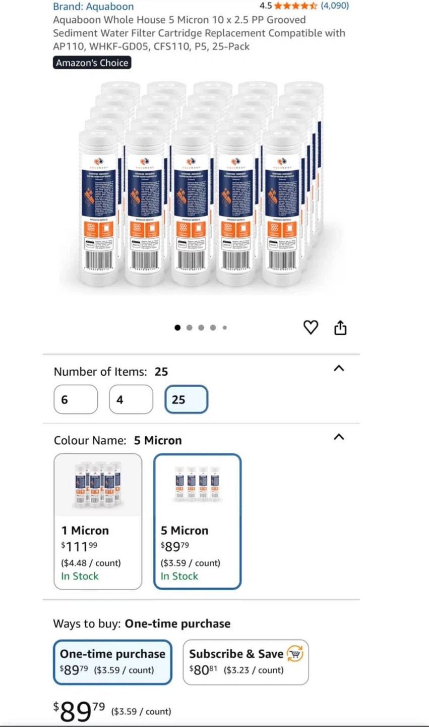 This is a 25-pack of Aquaboon whole house sediment water filter cartridges. They are 5 micron and 10 x 2.5 inches in size. These cartridges are compatible with various filter models including AP110, WHKF-GD05, CFS110, and P5.