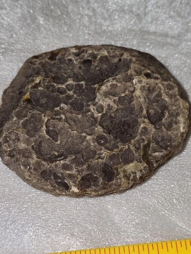 This is a polished agate geode half measuring 2.75 inches. It features maroon, yellow/brown, and white colors in a striking pattern. A great collectible item for rock and crystal enthusiasts.