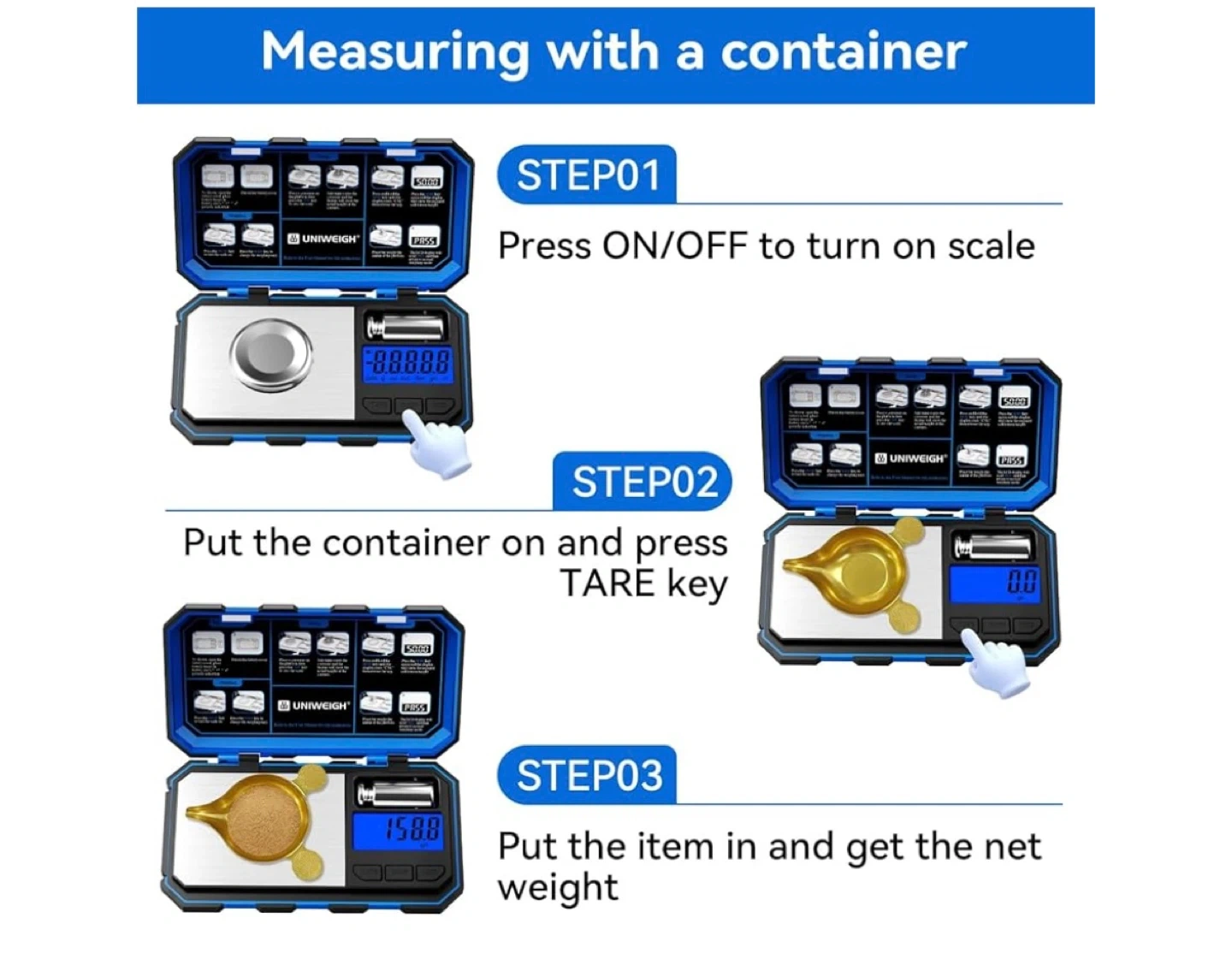 This UNIWEIGH digital scale is blue and comes in a protective case. It's a compact reloading scale that's easy to carry. The scale is rubber-coated, making it sturdy and durable. Includes a calibration weight pan.