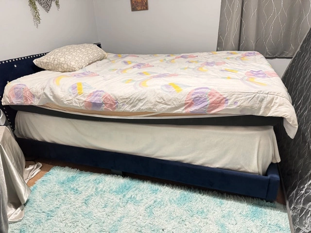 This is a used mattress with a floral pattern. It's a comfortable and sturdy mattress, perfect for a guest room or as a starter mattress. There are some signs of wear. Great value for the price! If you looking for queen bed frame i have one available.