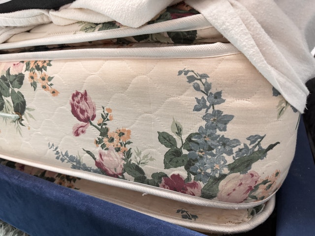 This is a used mattress with a floral pattern. It's a comfortable and sturdy mattress, perfect for a guest room or as a starter mattress. There are some signs of wear. Great value for the price! If you looking for queen bed frame i have one available.