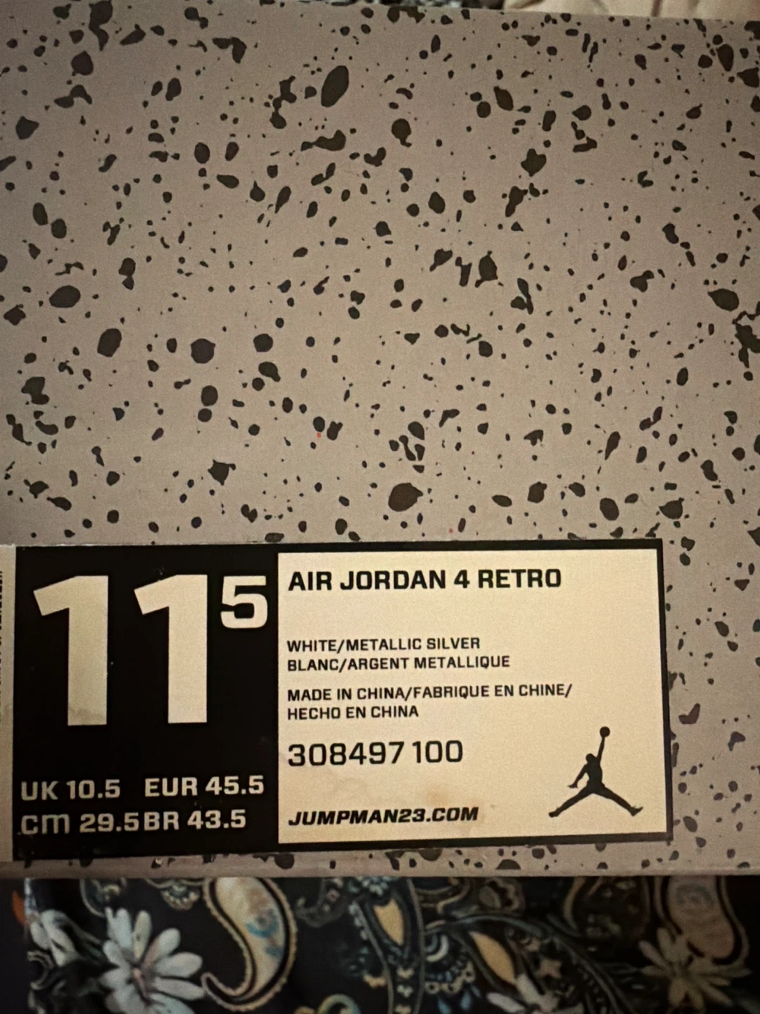 Air Jordan 4 Retro sneakers in a clean white and metallic silver colorway. These shoes come in their original box. Size 11.5 US.