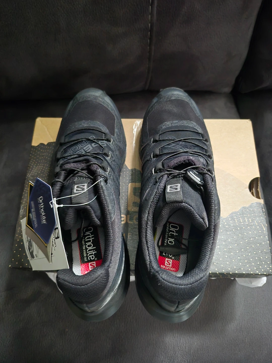 Black Salomon trail running shoes with GORE-TEX and OrthoLite insoles. These shoes are built for tough terrain. They're ready for your next outdoor adventure!