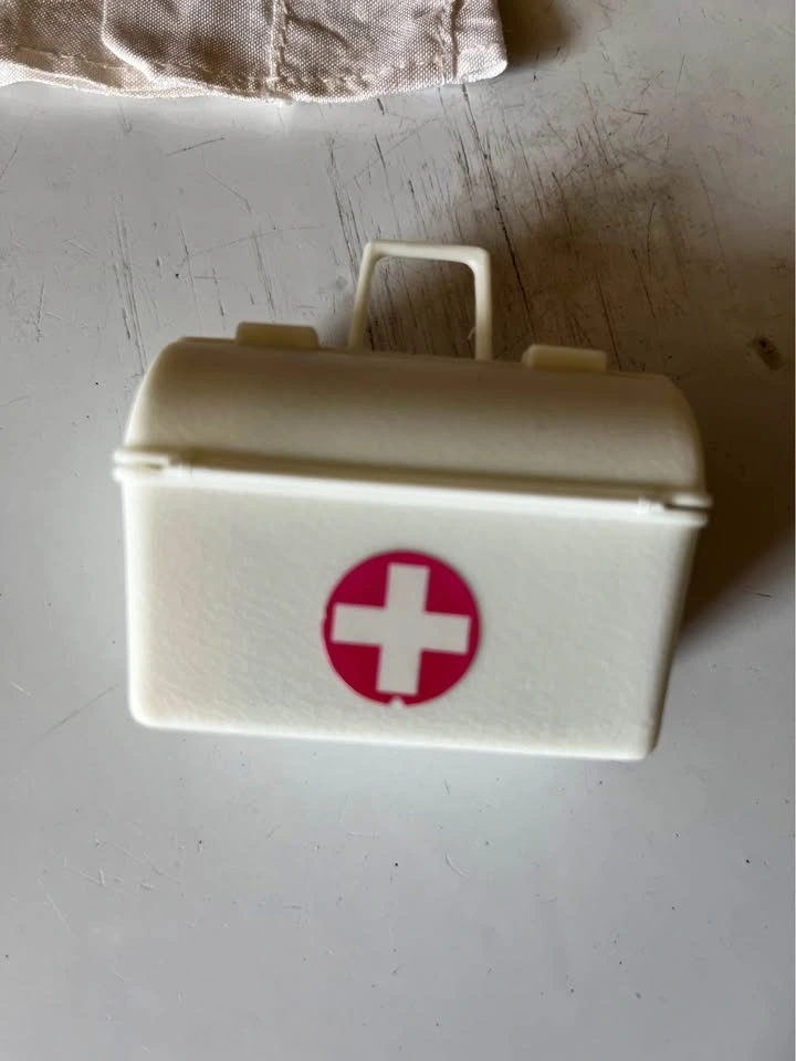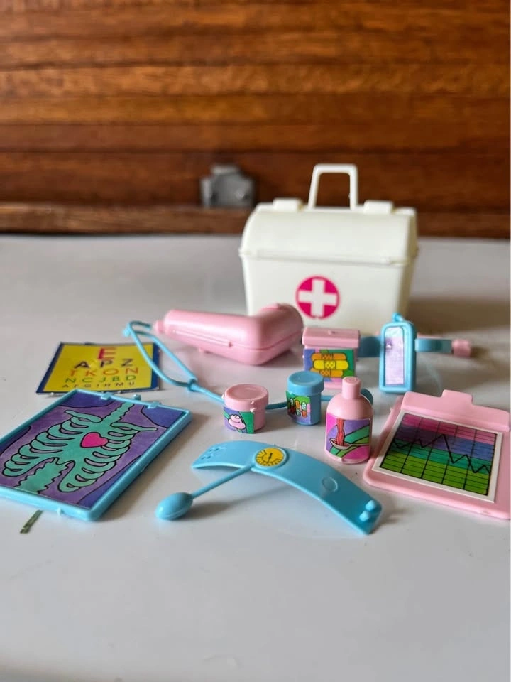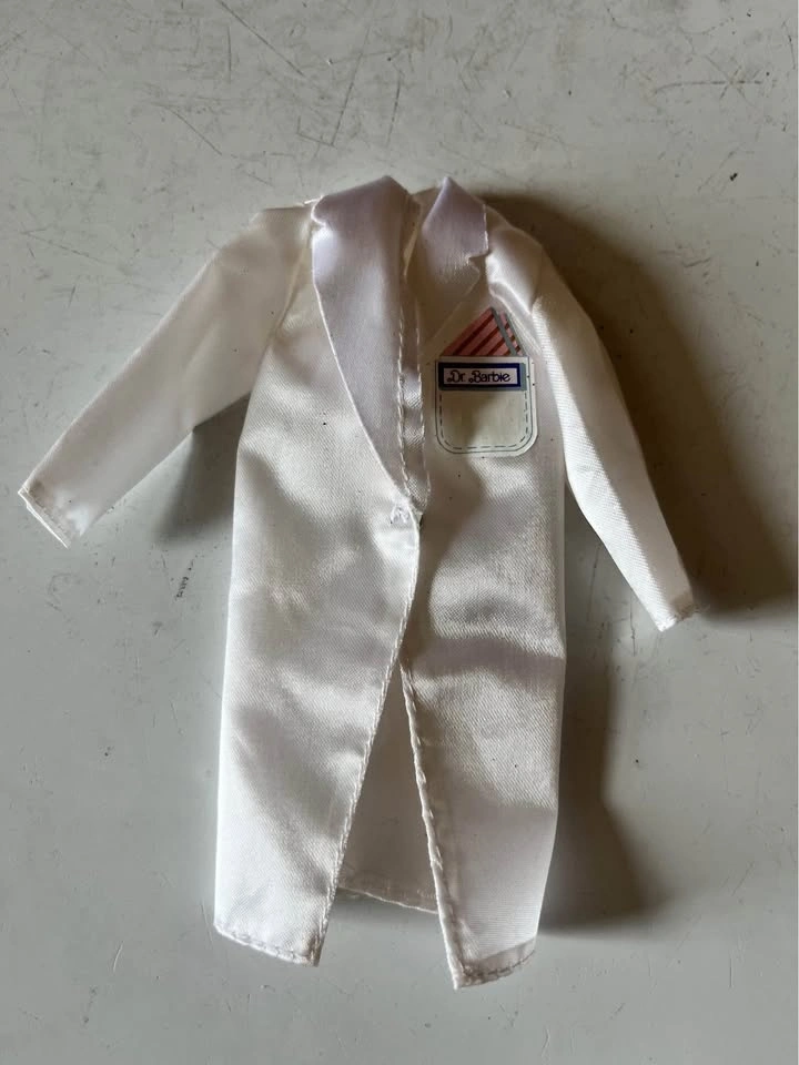 A fun set to add to your Barbie collection. It includes a lab coat and a doctor's bag filled with miniature medical items like a pill bottle, stethoscope, blood pressure monitor, and more. This is a complete set from the late 1970s.