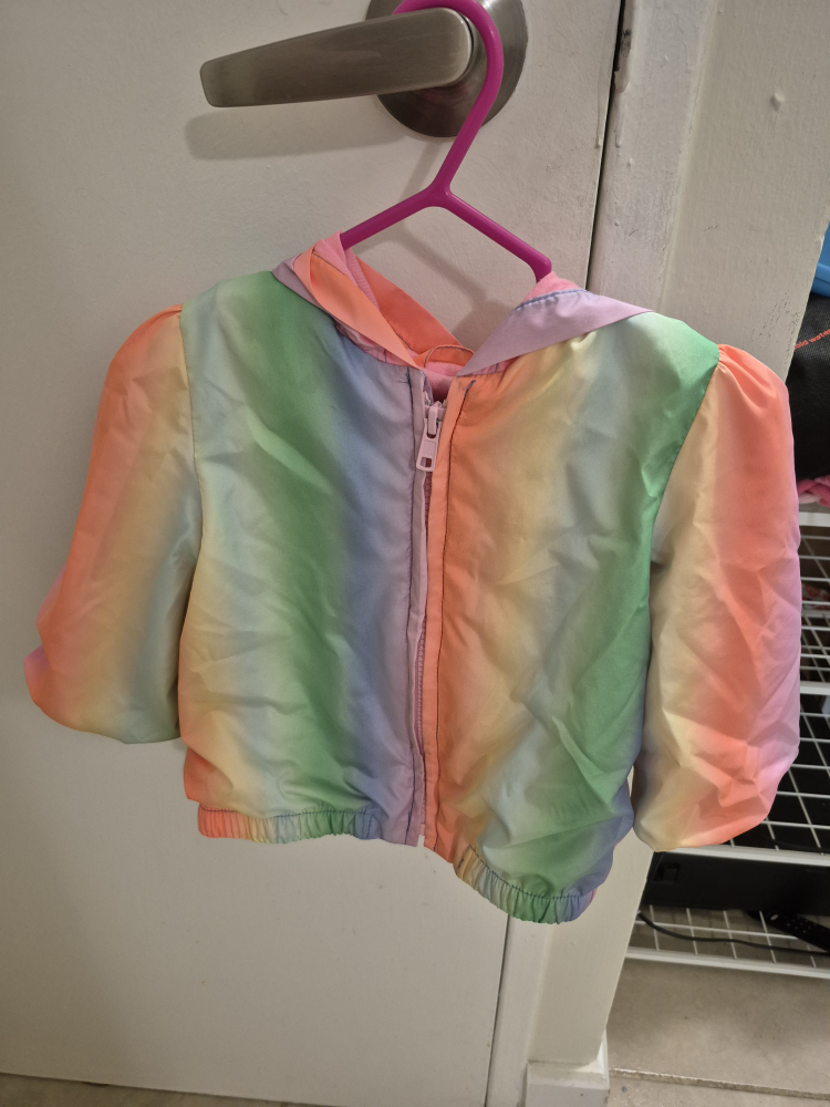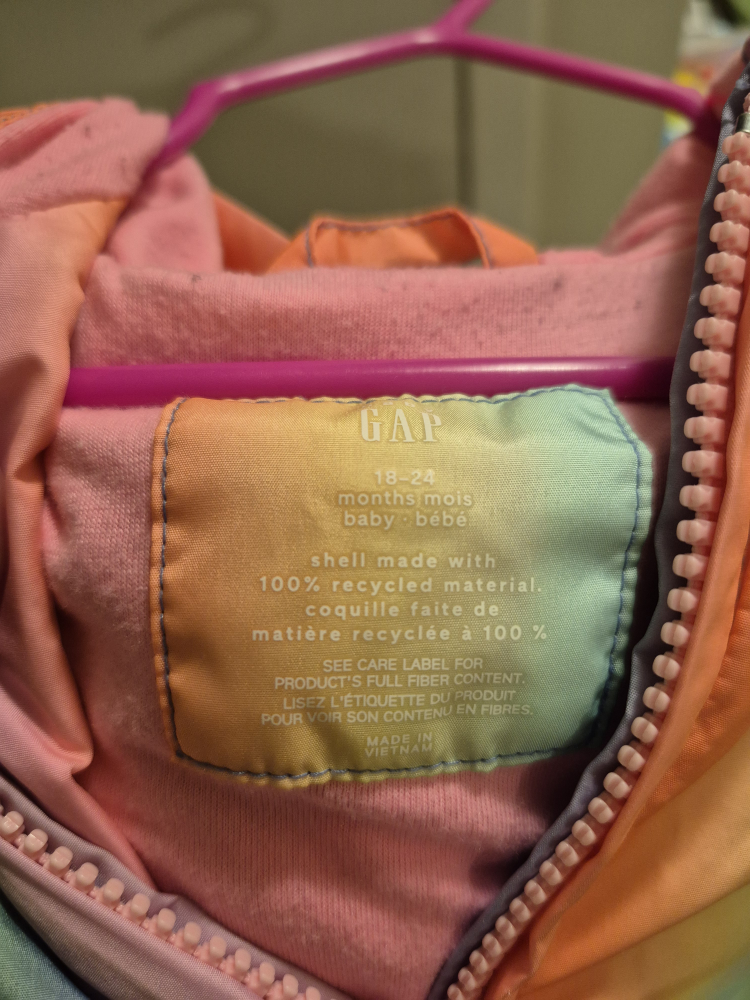 Super cute baby jacket from Gap! It's sized for 18-24 months. The shell is made with 100% recycled material, which is great. The rainbow colours are so fun! Located North end of St Thomas.