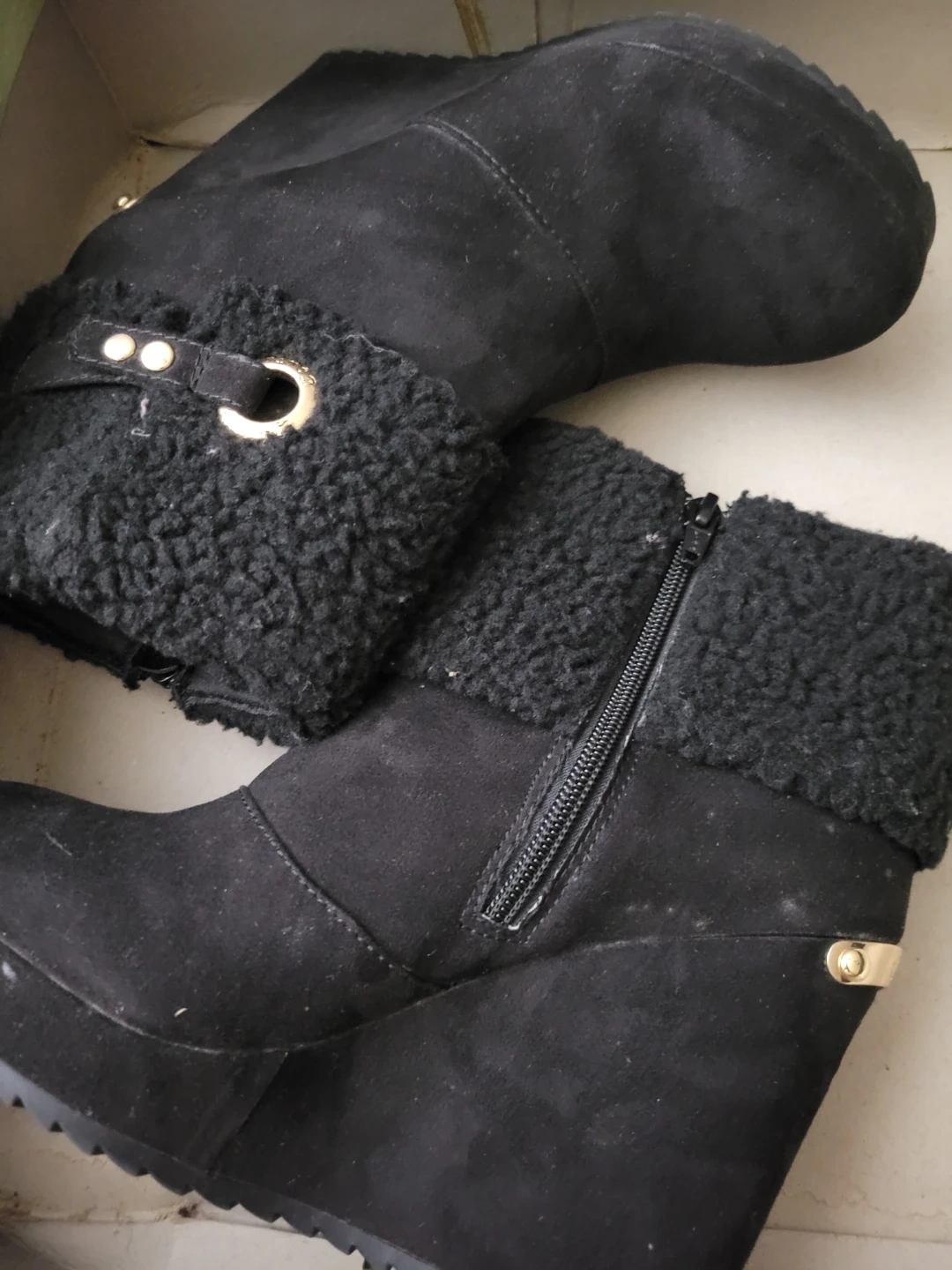 Cozy black suede wedge boots with a faux fur lining and side zipper. Features a stylish gold buckle detail. These boots are perfect for cold weather!