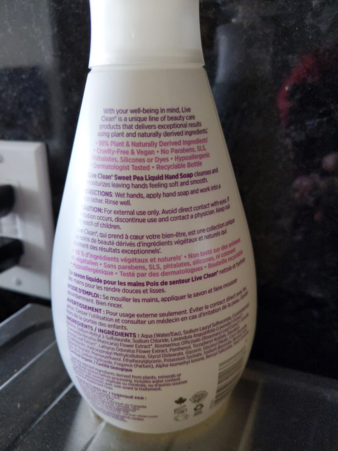 This Live Clean Sweet Pea liquid hand soap is made with 98% plant & naturally derived ingredients. It's cruelty-free and vegan. Bottle is recyclable. Formula is hypoallergenic.
