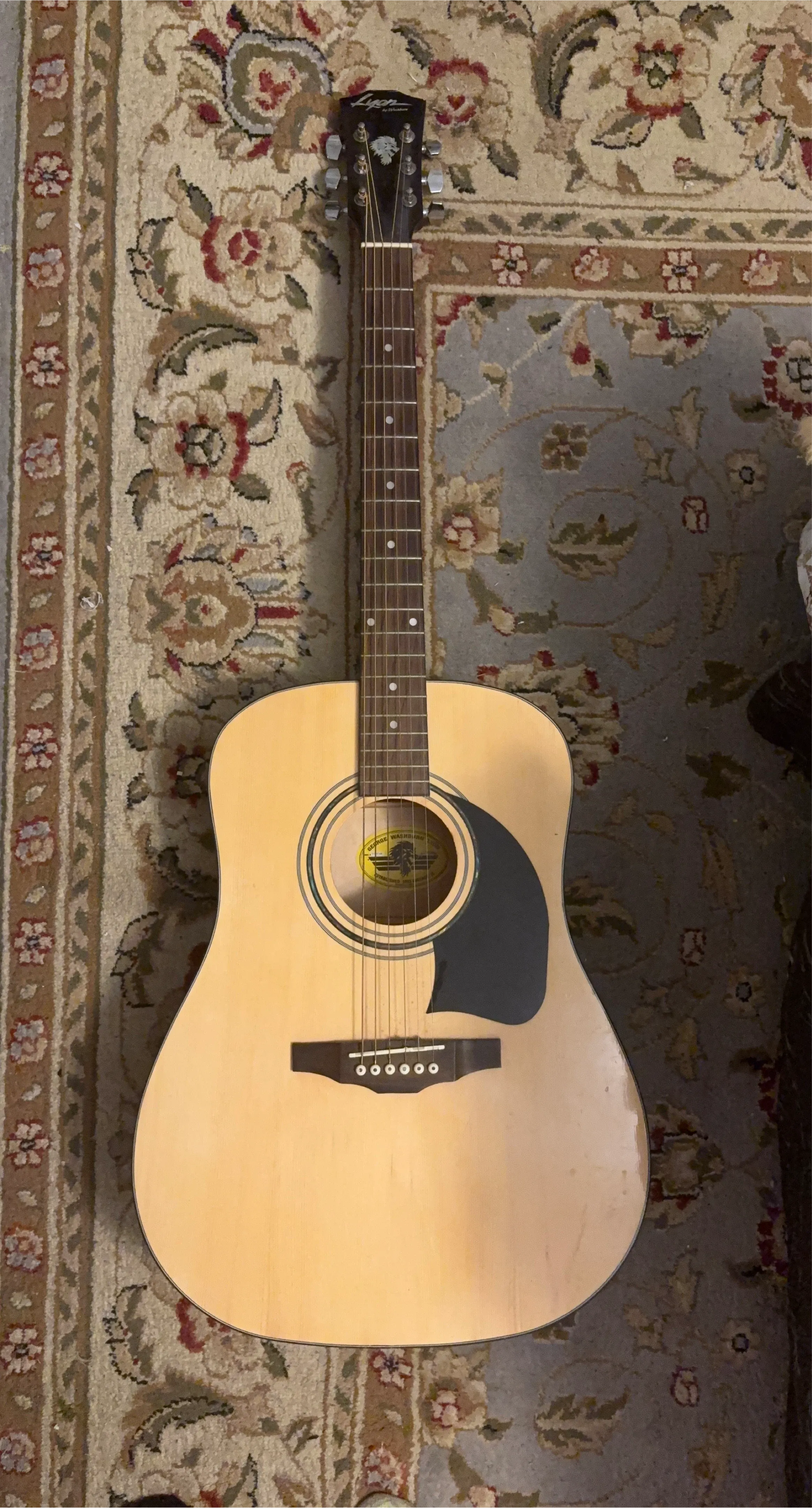 This is a Lyon by Washburn acoustic guitar. It has a natural wood finish and six strings. This guitar is perfect for beginners or anyone looking to pick up a new hobby!