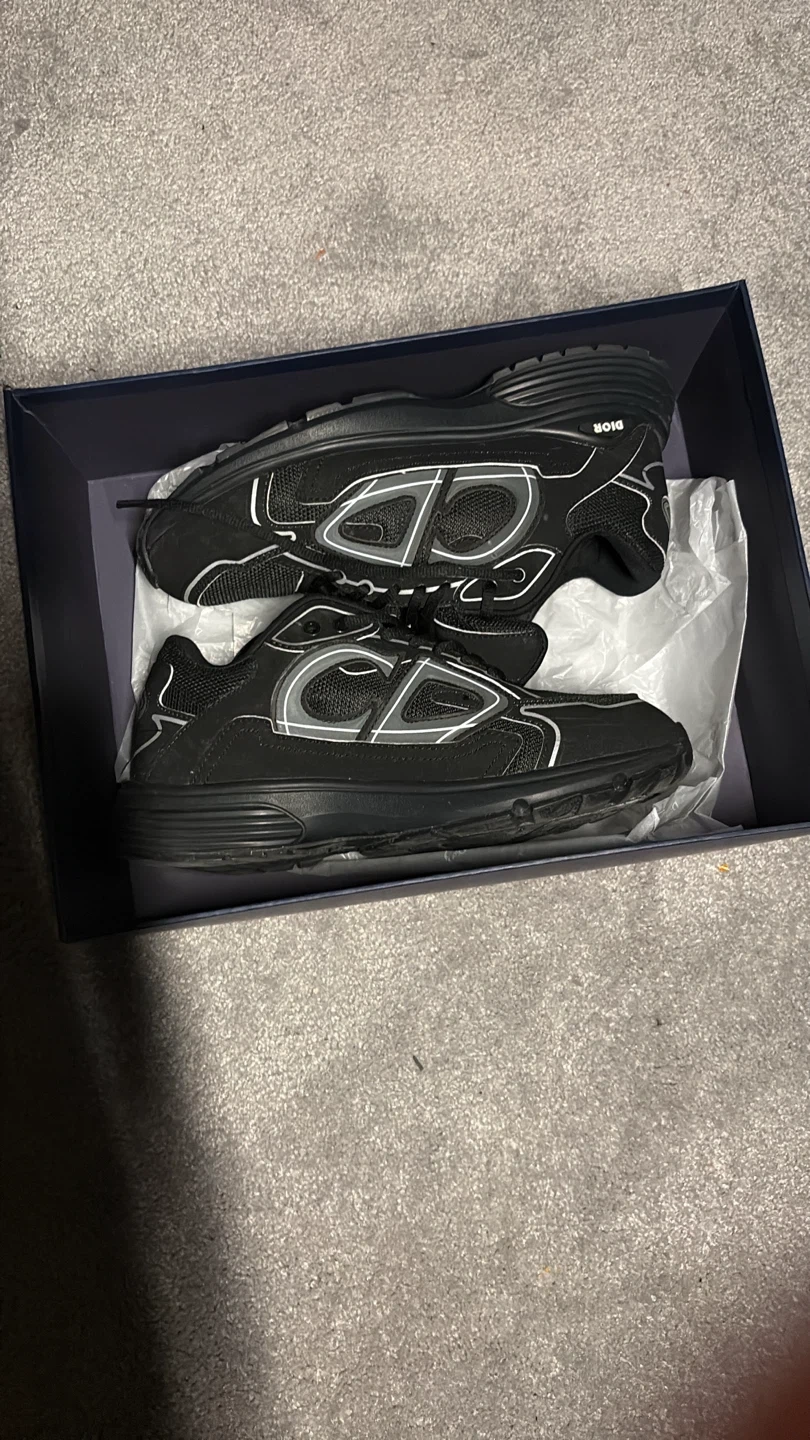 Black Dior B30 high top sneakers. These sneakers are in excellent condition and come with the original box and dust bag. They feature the iconic CD logo.