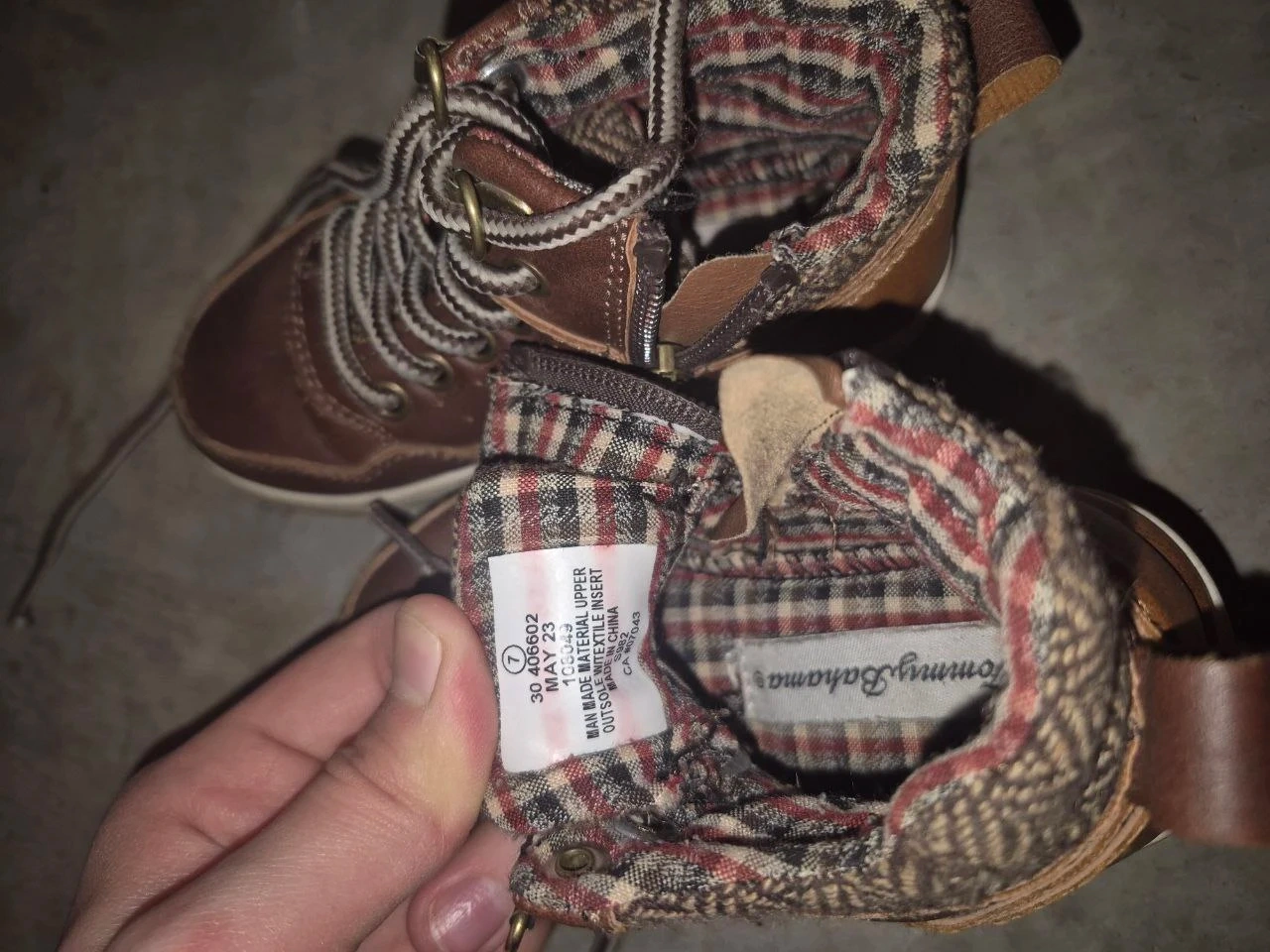 These Tommy Bahama boots are a stylish brown colour with plaid lining. They're a size 7 and feature a convenient lace-up and side zipper closure. Pick up only!