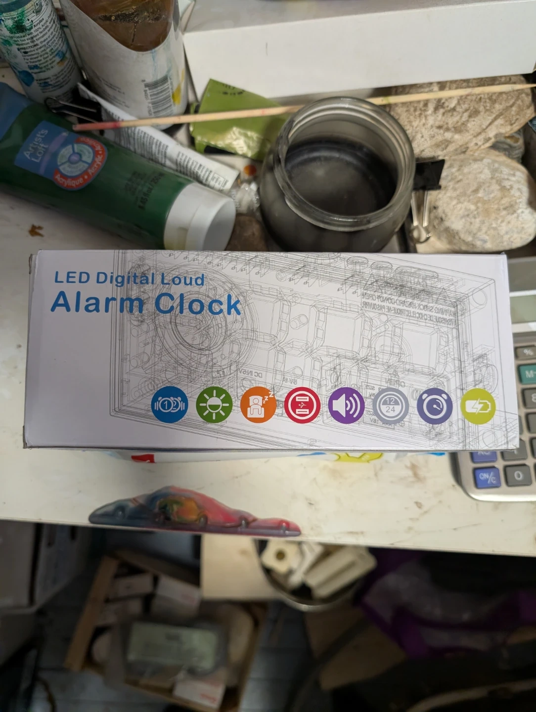 This is an LED digital loud alarm clock. It comes with a power adapter and two USB cables. The clock has multiple functions including brightness adjustment and volume control.
