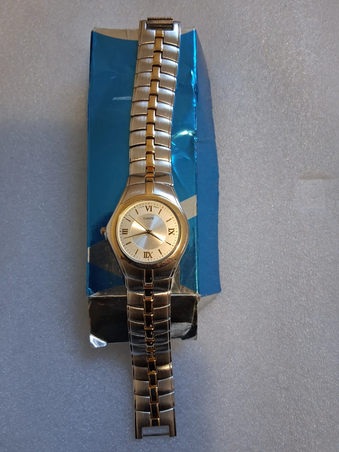 This two-tone quartz watch features a classic design with Roman numerals on the dial. Its band is a combination of silver and gold-toned metal links. This watch is powered by a quartz movement. It's new, but you will need to put s battery