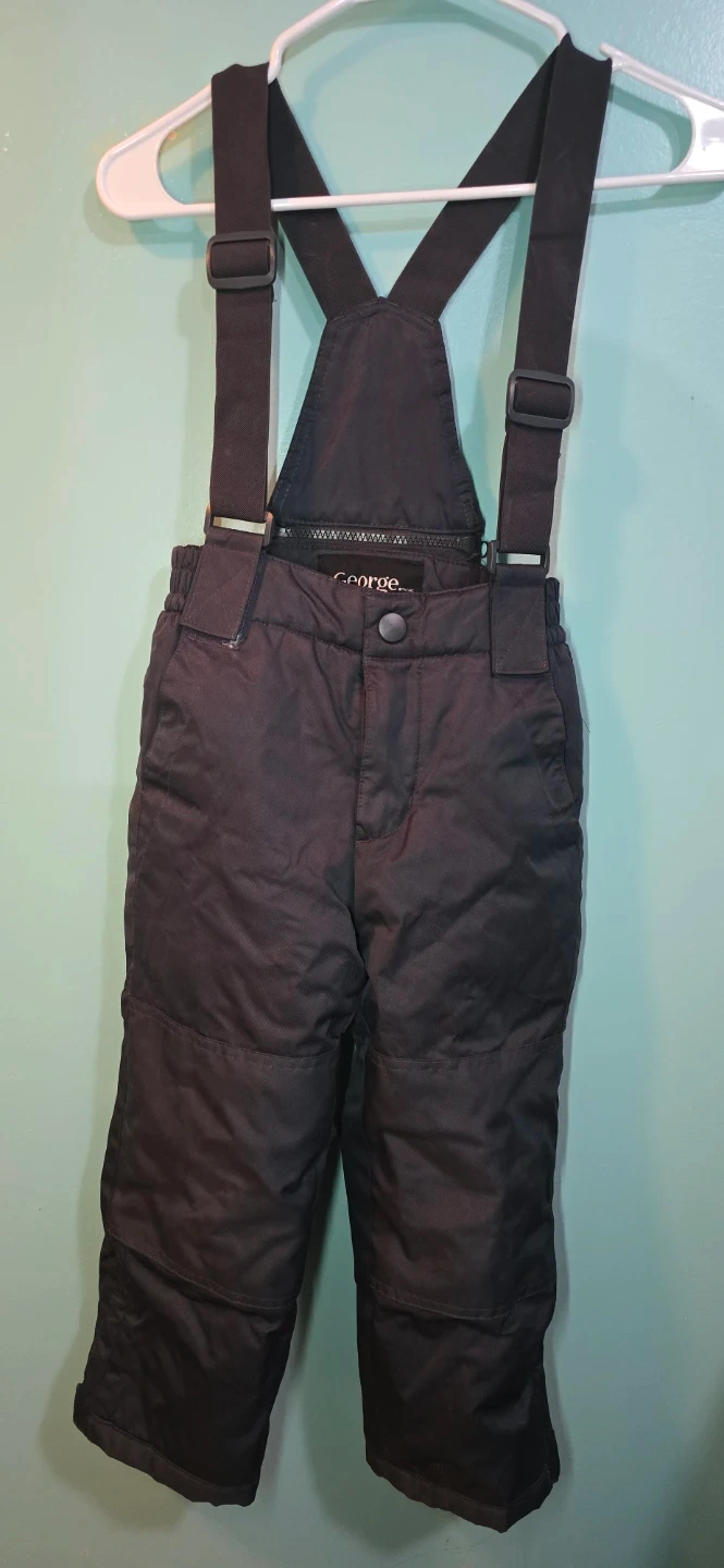 George black snow bibs with adjustable suspenders and a zippered front. Size XS/TP, fitting 4-5 years old. Made with 100% polyester shell and lining. Great for keeping kids warm and dry during winter activities!
