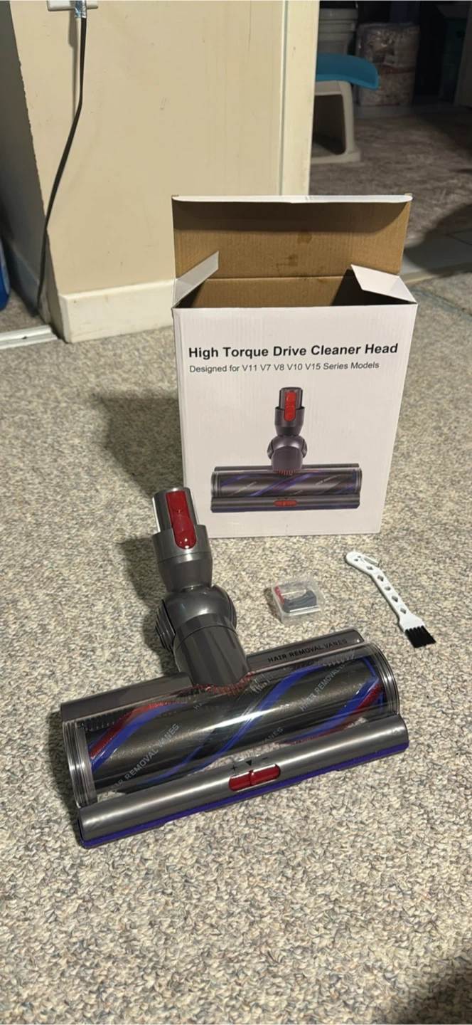 This is a High Torque Drive Cleaner Head designed for Dyson V11, V7, V8, V10, and V15 series models. It includes the main cleaner head, a small cleaning brush, and a small tool for hair removal. Some assembly may be required upon receipt.