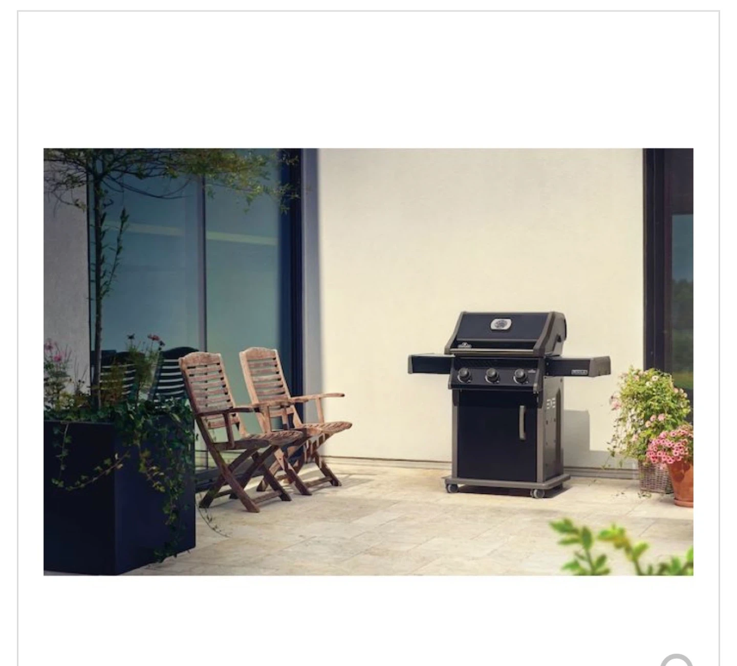 Napoleon Rogue 425 propane gas grill. Features three main burners and a main cooking area of 23.75" x 18". It has 42,000 BTU main BTU. This grill is black.