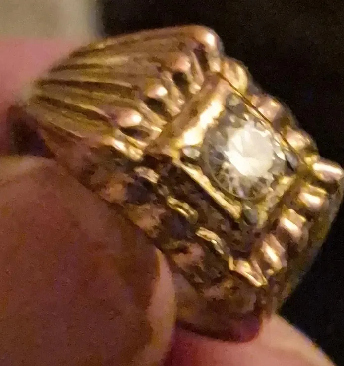 This is a striking gold-tone ring. It features a prominent clear stone set in the centre. The band has a decorative, textured design.
