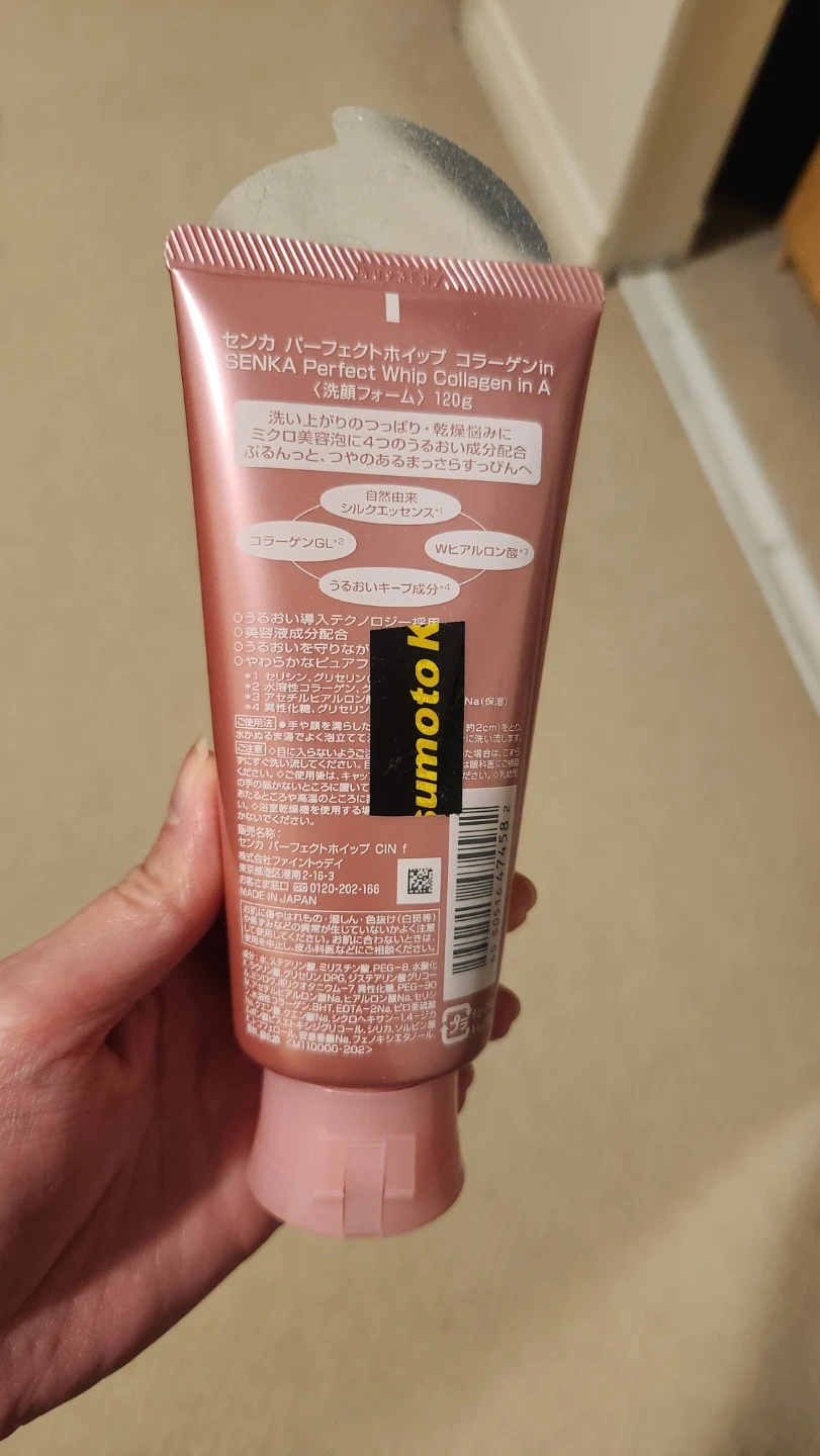 This Brand New Senka Perfect Whip beauty foam cleanser contains collagen and hyaluronic acid. It's formulated for deep cleansing while moisturizing. A 120g tube of facial cleanser.