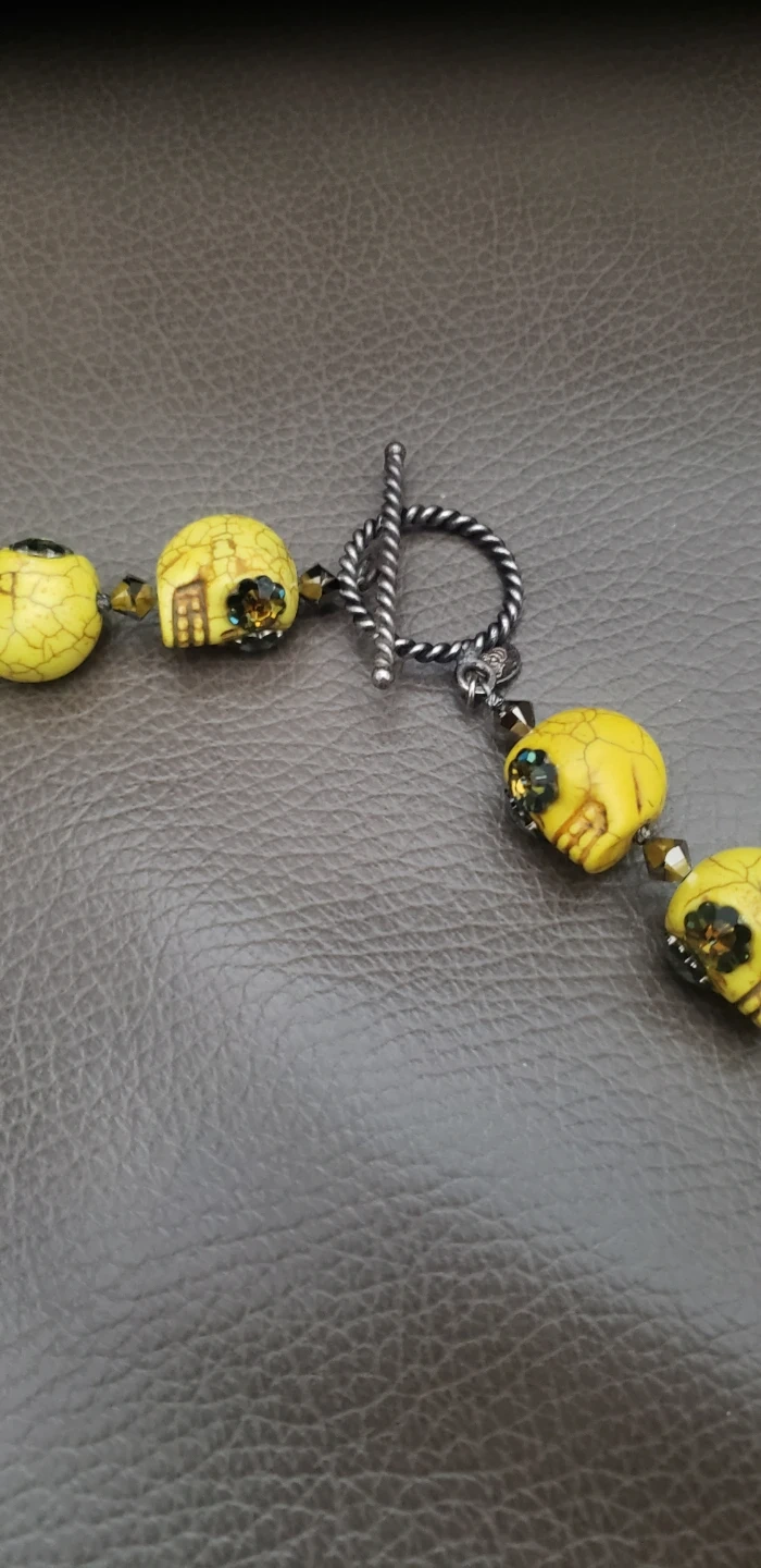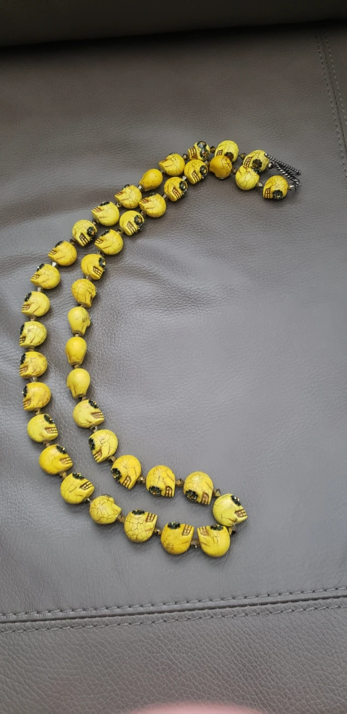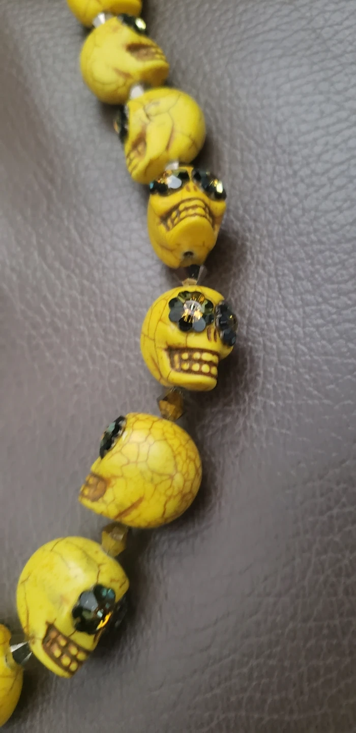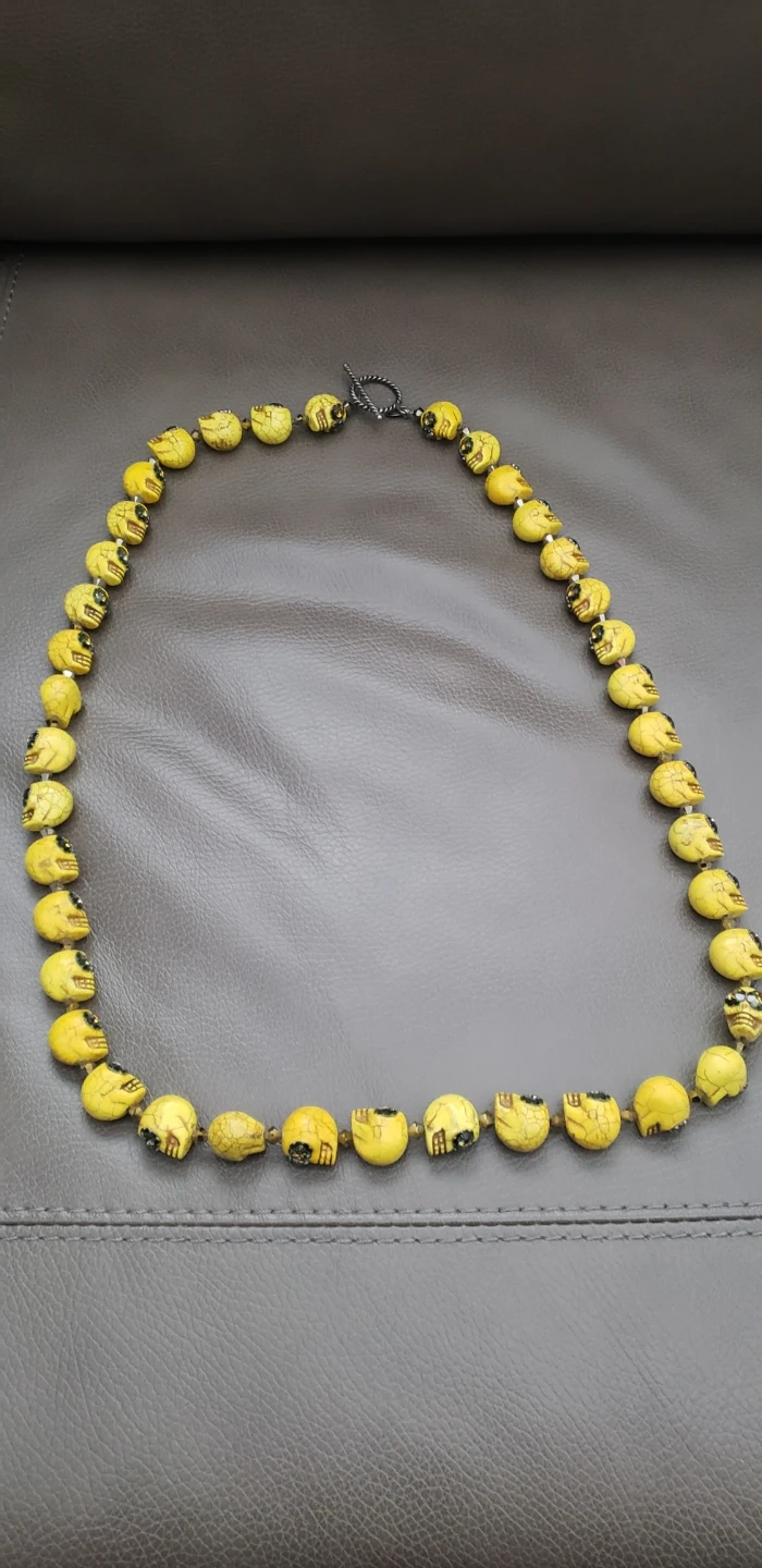 Pre Owned designer necklace, features an ornate silver tone clasp and measures 35 inches in length. This handcrafted and artisan jewelry piece is signed by the brand She Bee and is designed for unisex adults. The necklace incorporates elements of skulls, crystal beads, and a Halloween or Day of the Dead theme, making stylish and unique accessory for those who appreciate artisan craftsmanship. This necklace is a striking piece that would be a standout addition to any jewelry collection.