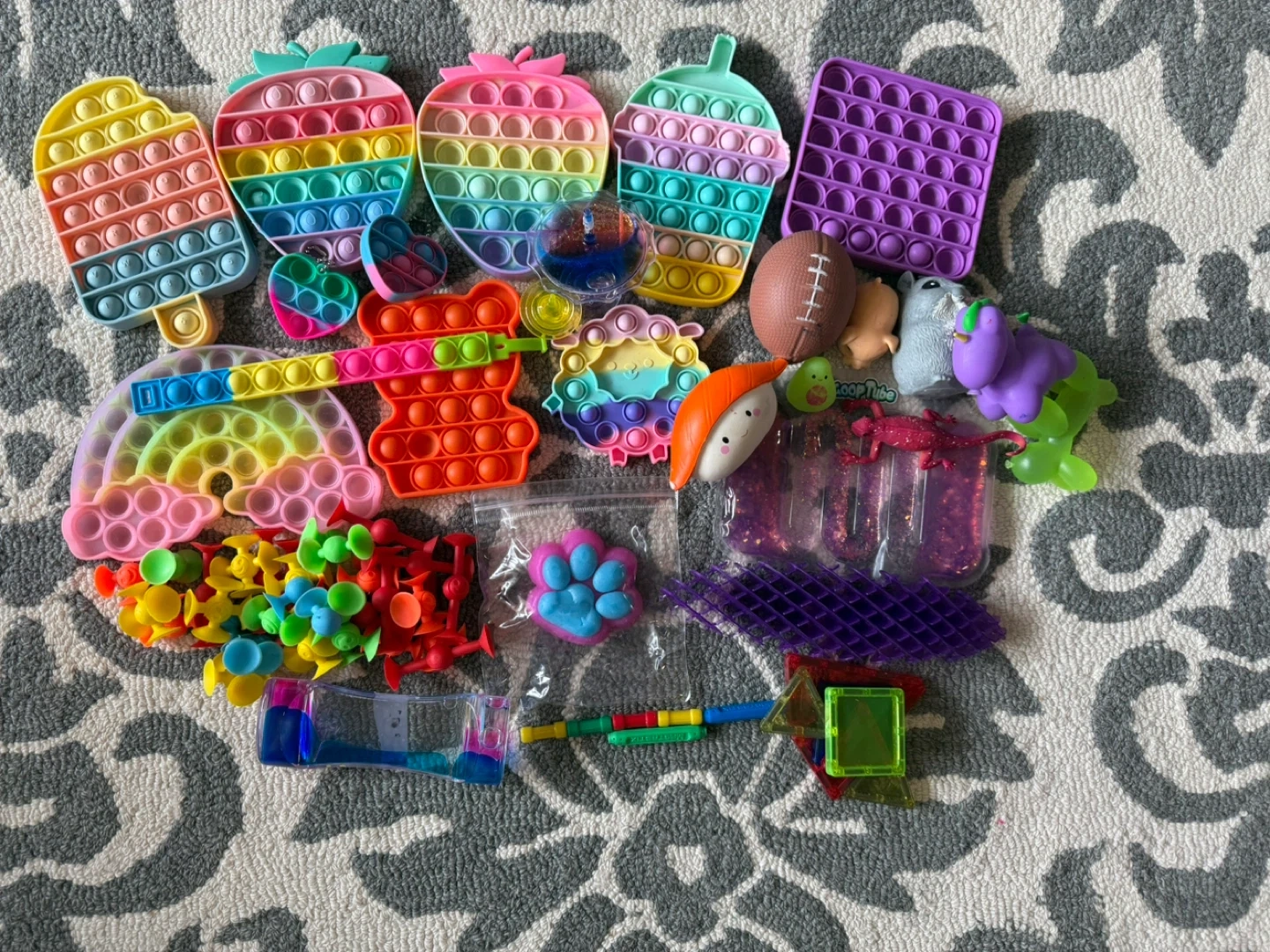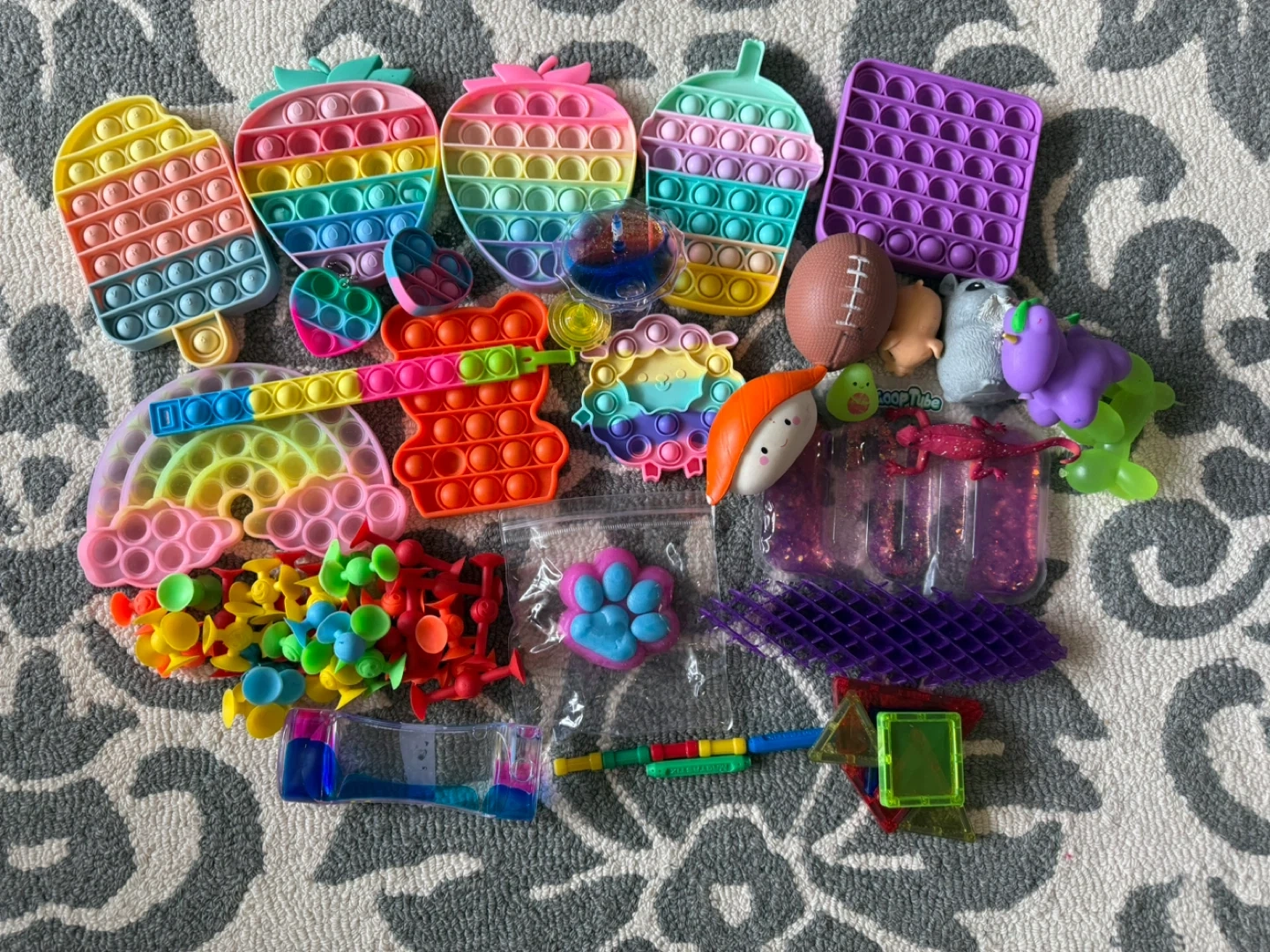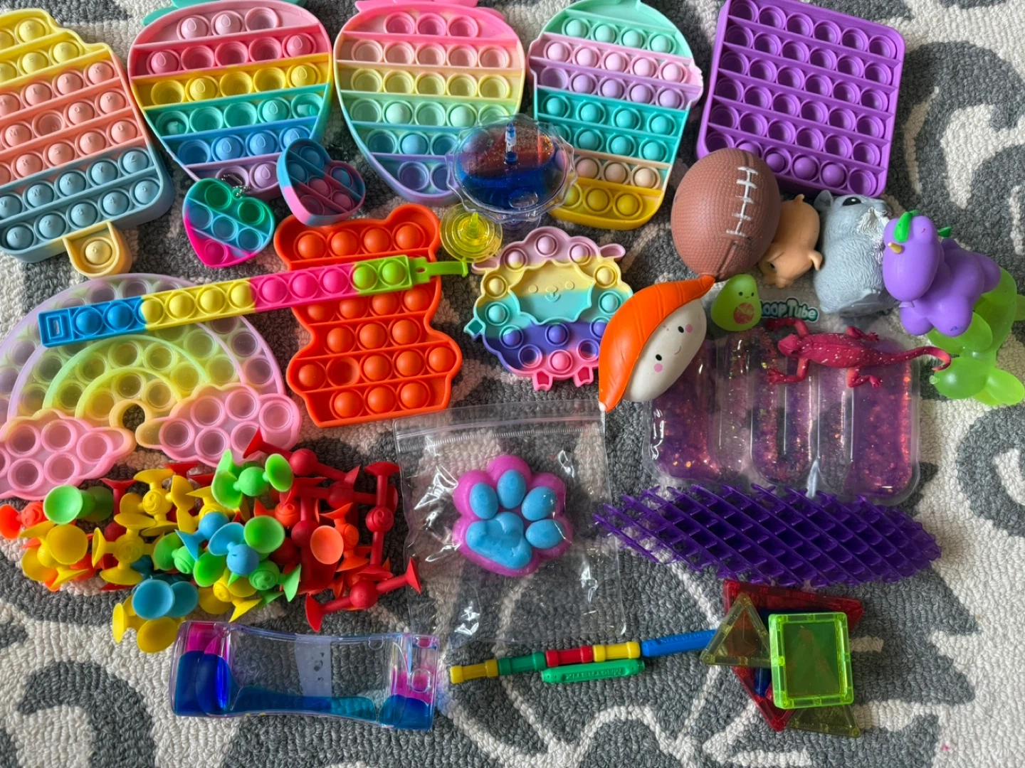 This is a collection of assorted fidget toys. Includes pop-its, stress balls, and other sensory toys. Great for kids and adults needing some stress relief!
