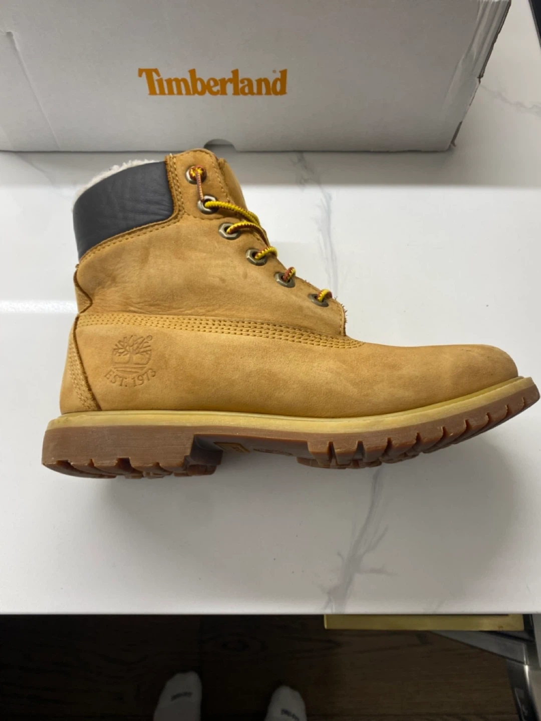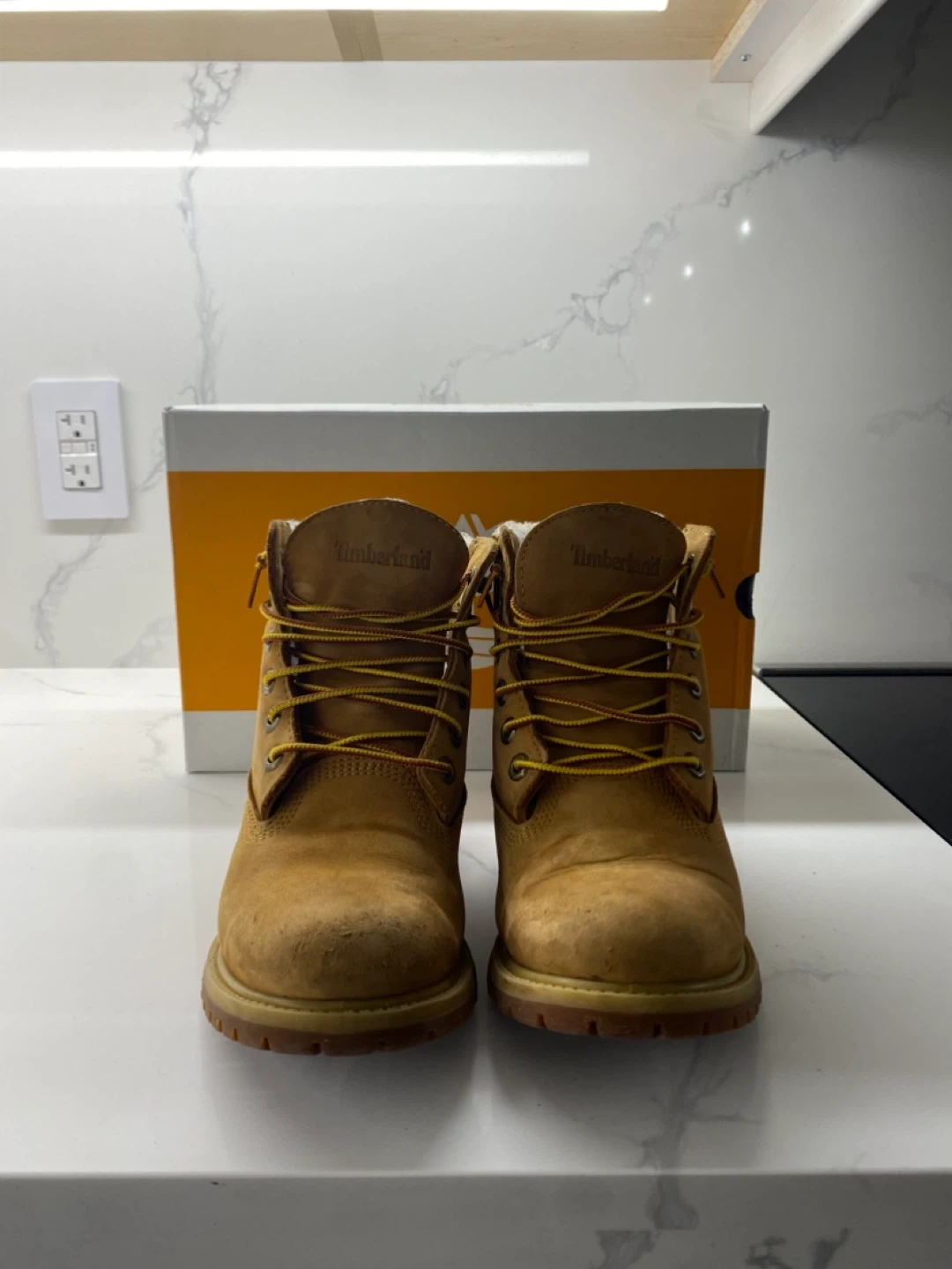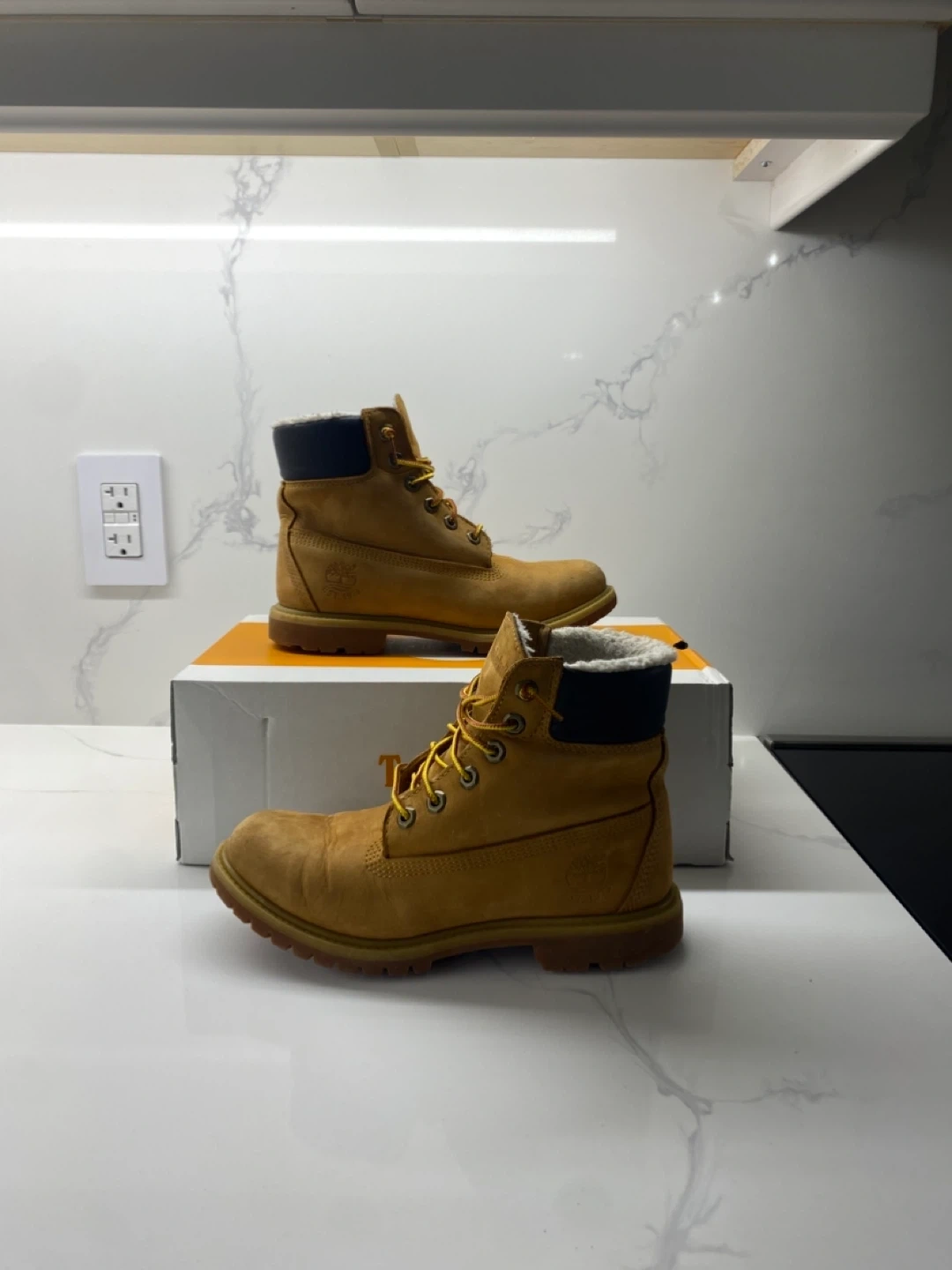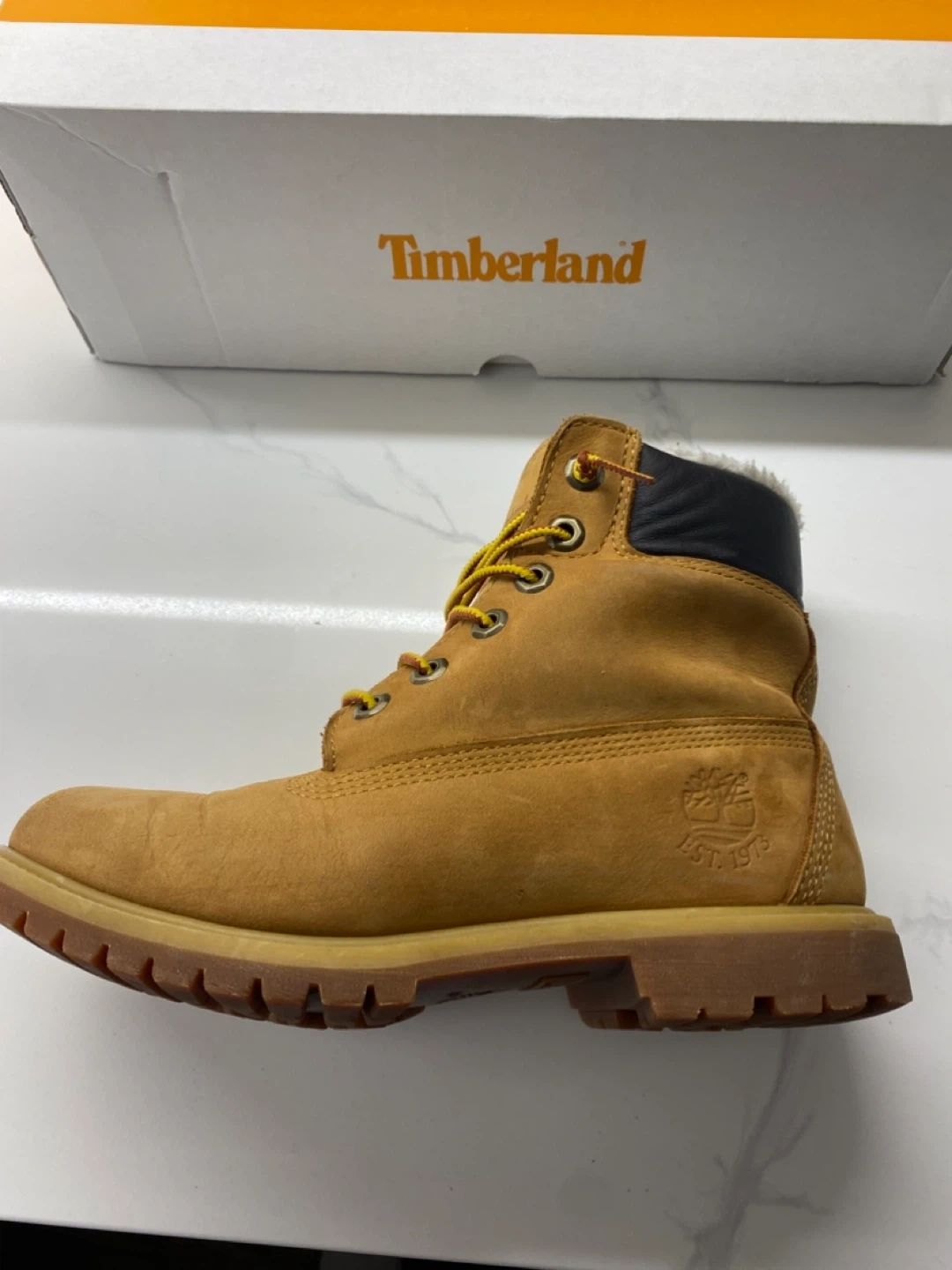 Selling a pair of Timberland boots in a size 6. They are in good condition and come with the original box. Perfect for the fall and winter weather!