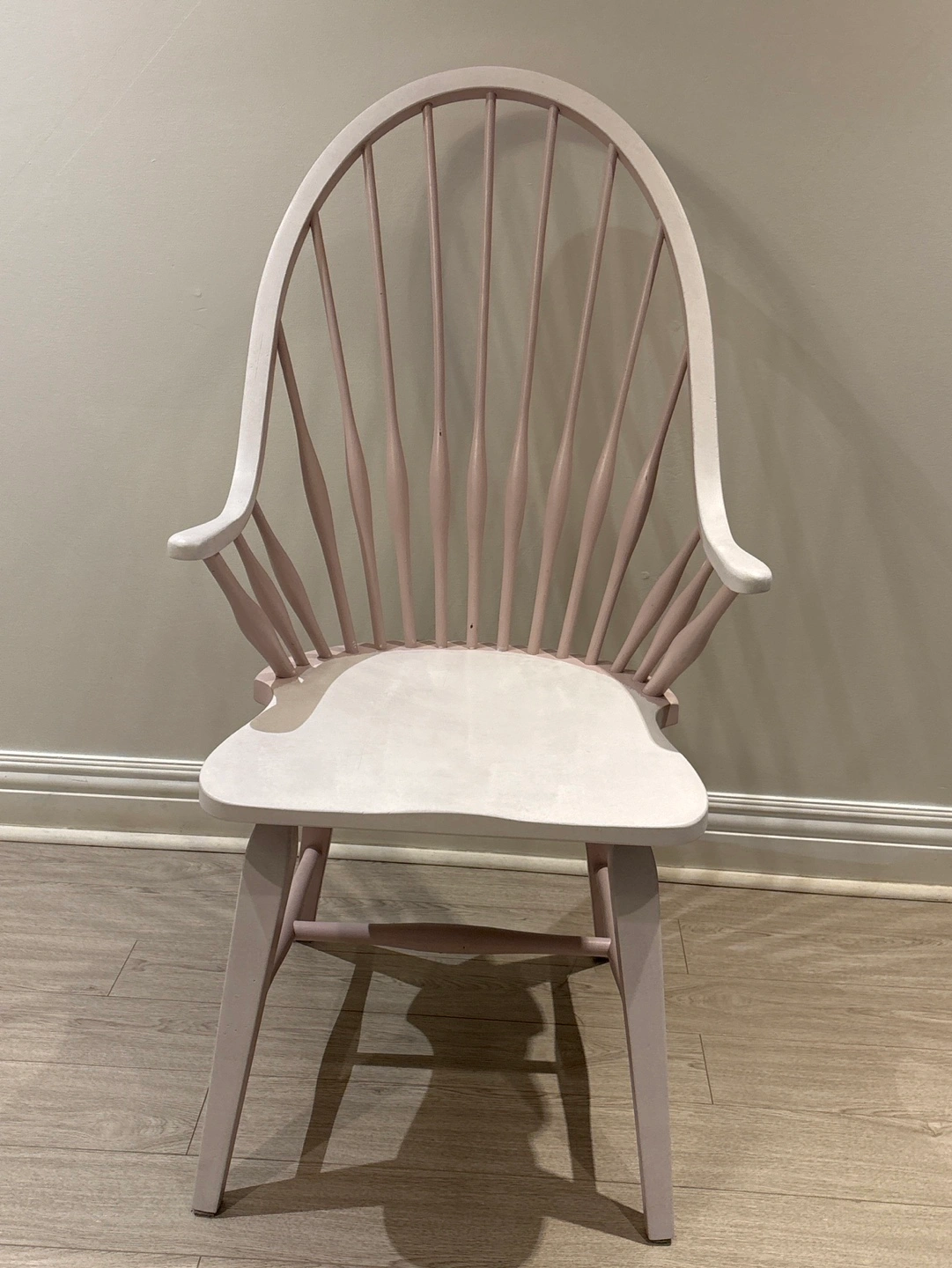 Charming painted Windsor armchair. Features a gently curved back and spindle detailing. Light pink and off-white finish. Solid wood construction. Suitable for dining room or living room.