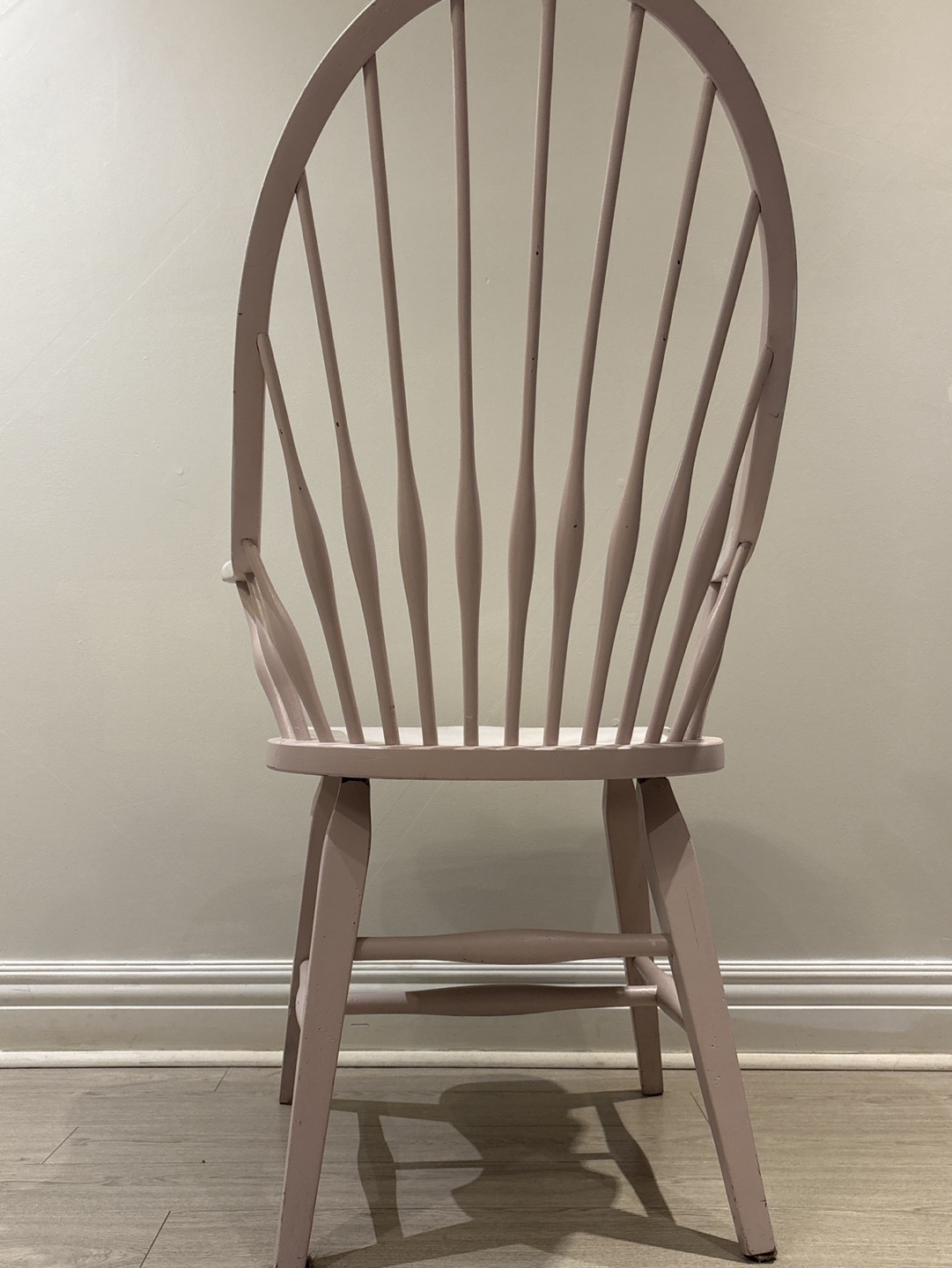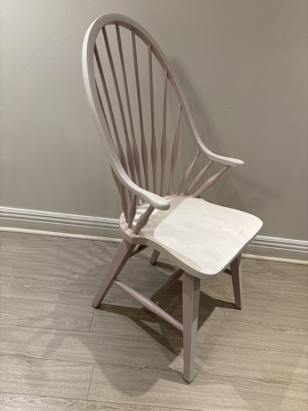 Charming painted Windsor armchair. Features a gently curved back and spindle detailing. Light pink and off-white finish. Solid wood construction. Suitable for dining room or living room.