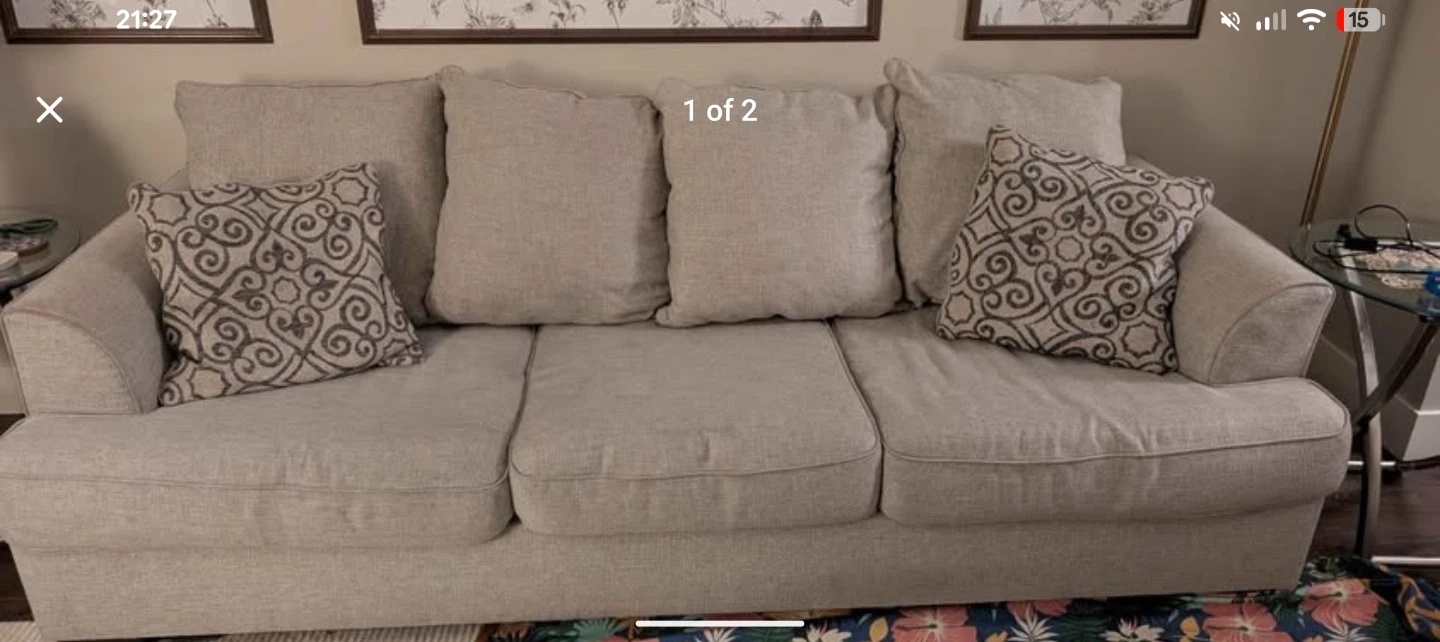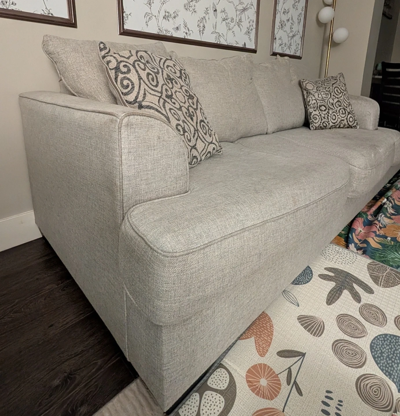 Comfortable three-seater sofa in a neutral beige fabric. Comes with four decorative accent pillows, two with an intricate grey pattern. It's a great addition to any living space!