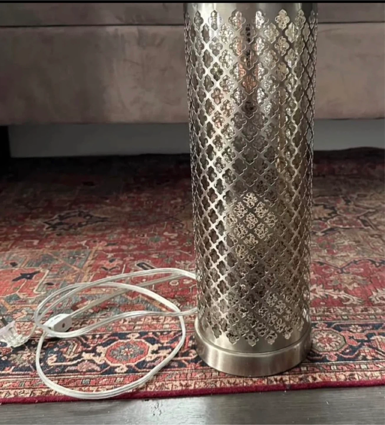 A stylish table lamp with a decorative metal lattice shade. It casts a warm, ambient glow when lit. This lamp's unique design adds a touch of elegance to any room.