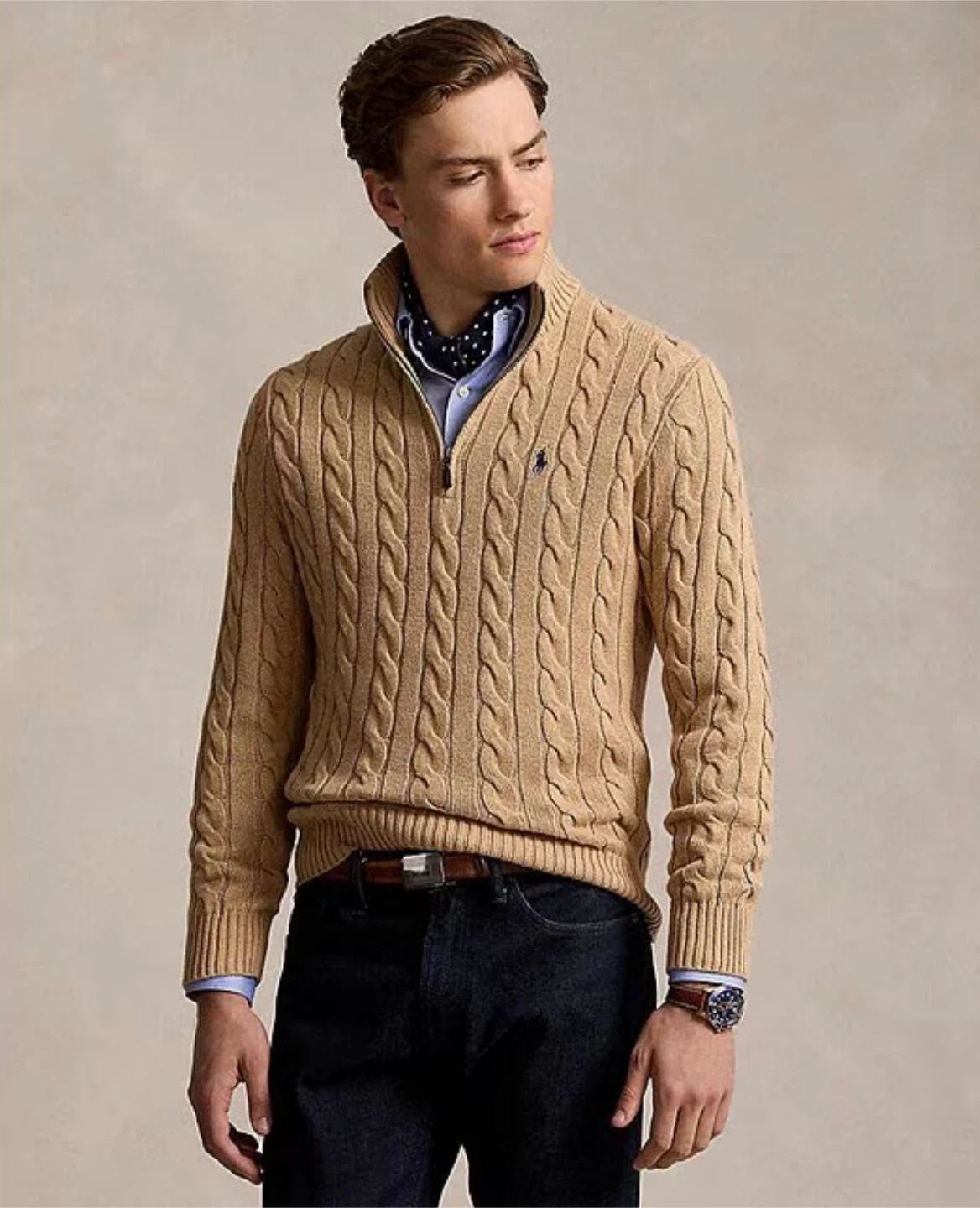Selling a brand new Ralph Lauren cable-knit quarter-zip sweater! It's a size L and still in its original packaging. This classic sweater is perfect for adding a touch of style to any outfit. The cable-knit design and quarter-zip make it both comfortable and fashionable