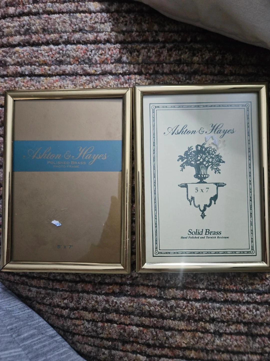 Two Ashton & Hayes photo frames. Both are solid brass with a polished finish. Each frame is sized for a 5x7 photo. They're perfect for displaying your cherished memories!