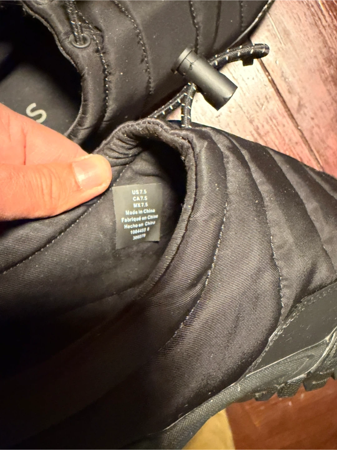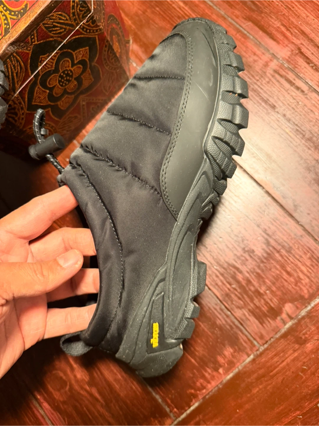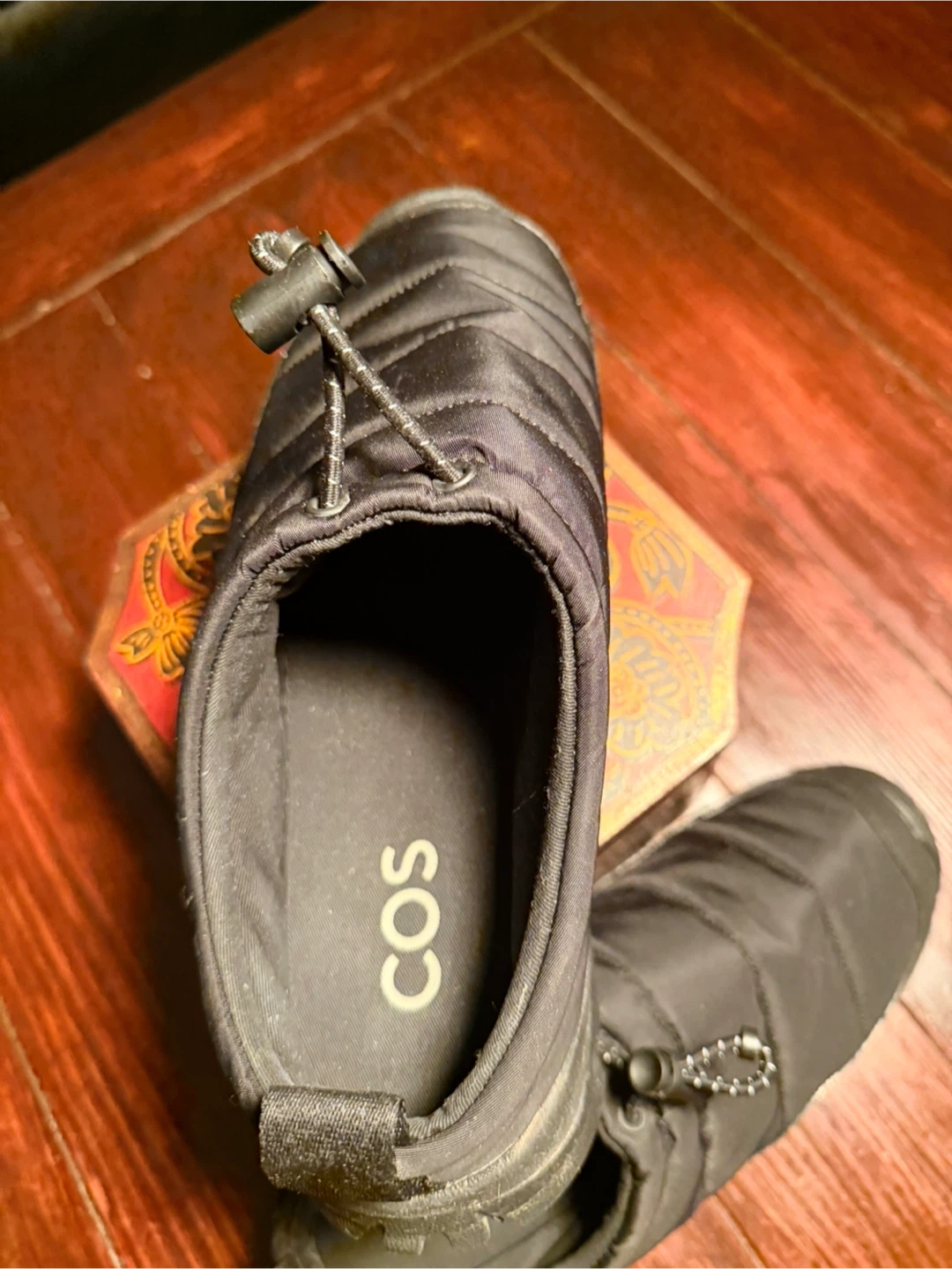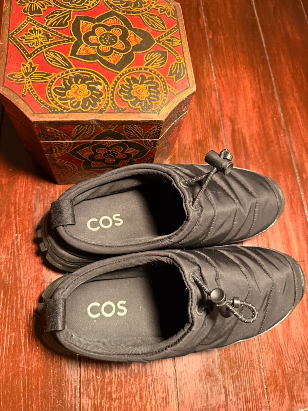 These COS black quilted puffer slip-on shoes are designed for comfort and warmth. They feature a durable Vibram sole for excellent traction. Perfect for casual wear or as cozy house shoes!