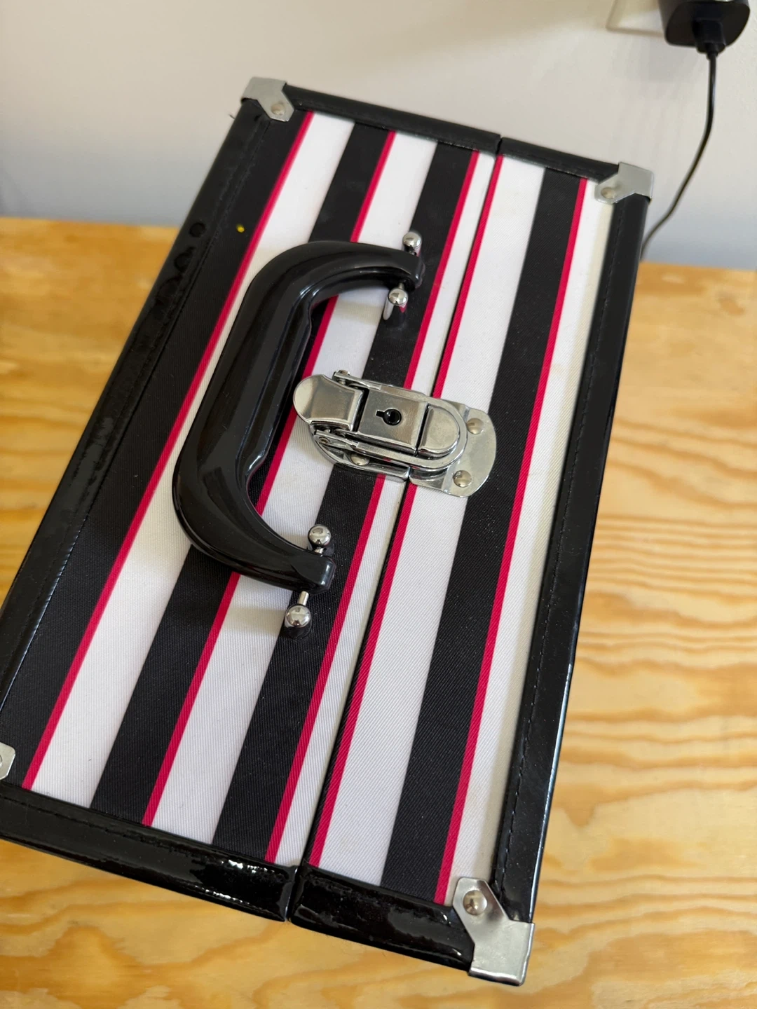 This is a Caboodles train case with a mirror inside. It has multiple trays for organization. The exterior is black and white stripes with pink accents. It's great for storing makeup or craft supplies!