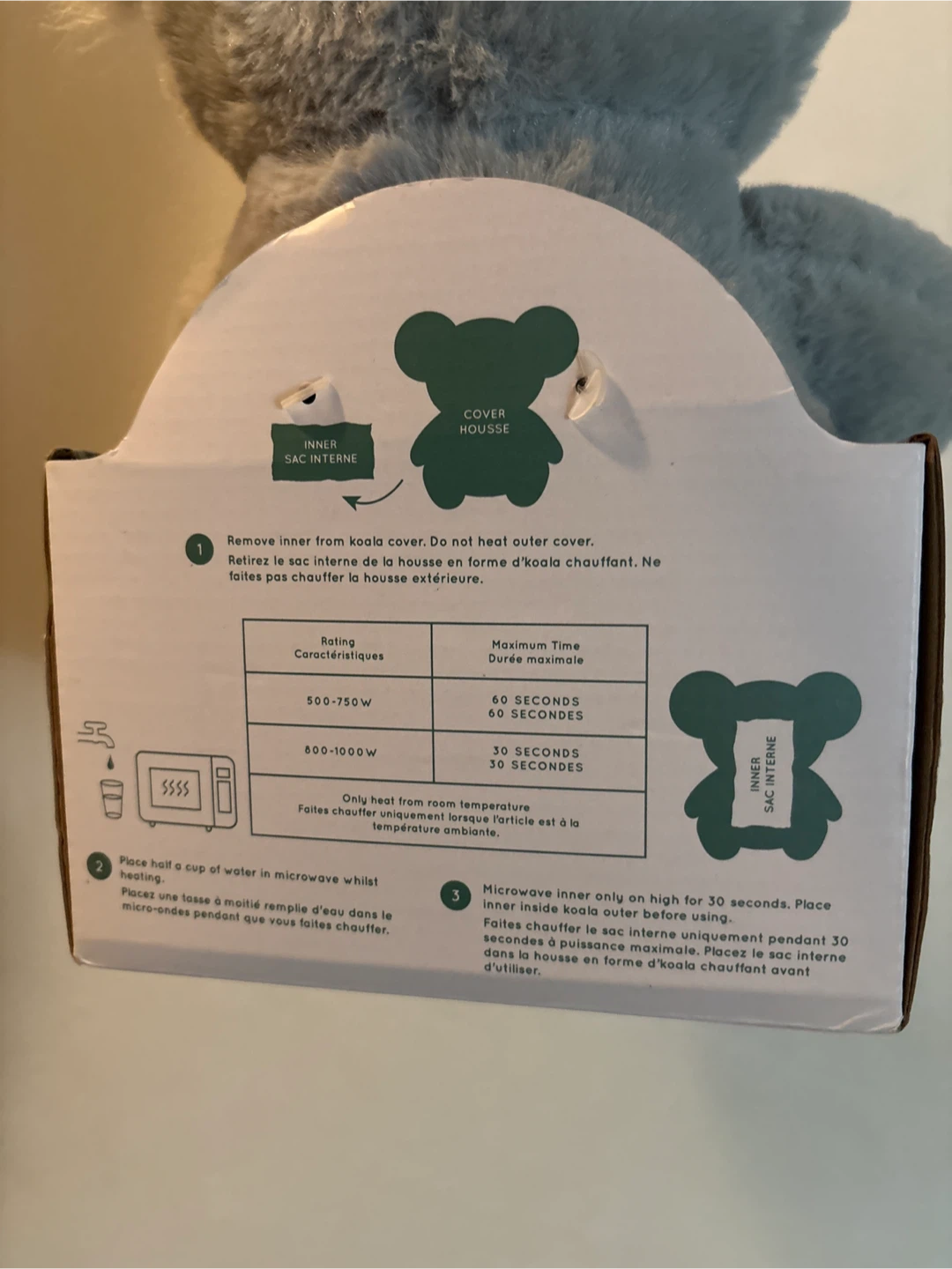 This is a huggable koala plush toy. It's designed to be microwaved for warmth. The inner bag holds heat for up to 60 seconds depending on wattage.