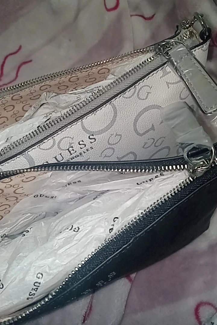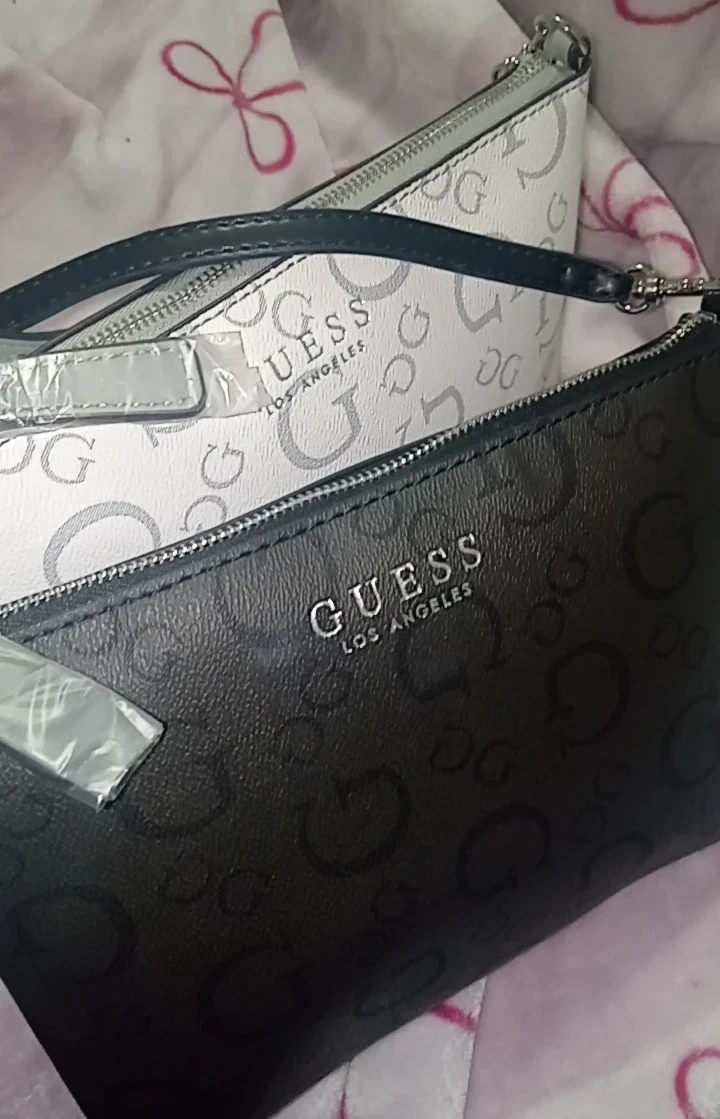 two Guess Los Angeles clutches. One is white with the grey iconic G logos, the other is black with black G logos. Both have zipper closures and straps. Brand new never worn before with packaging still inside