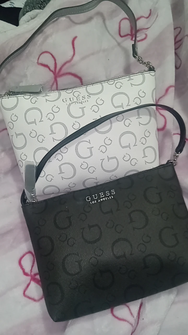 two Guess Los Angeles clutches. One is white with the grey iconic G logos, the other is black with black G logos. Both have zipper closures and straps. Brand new never worn before with packaging still inside